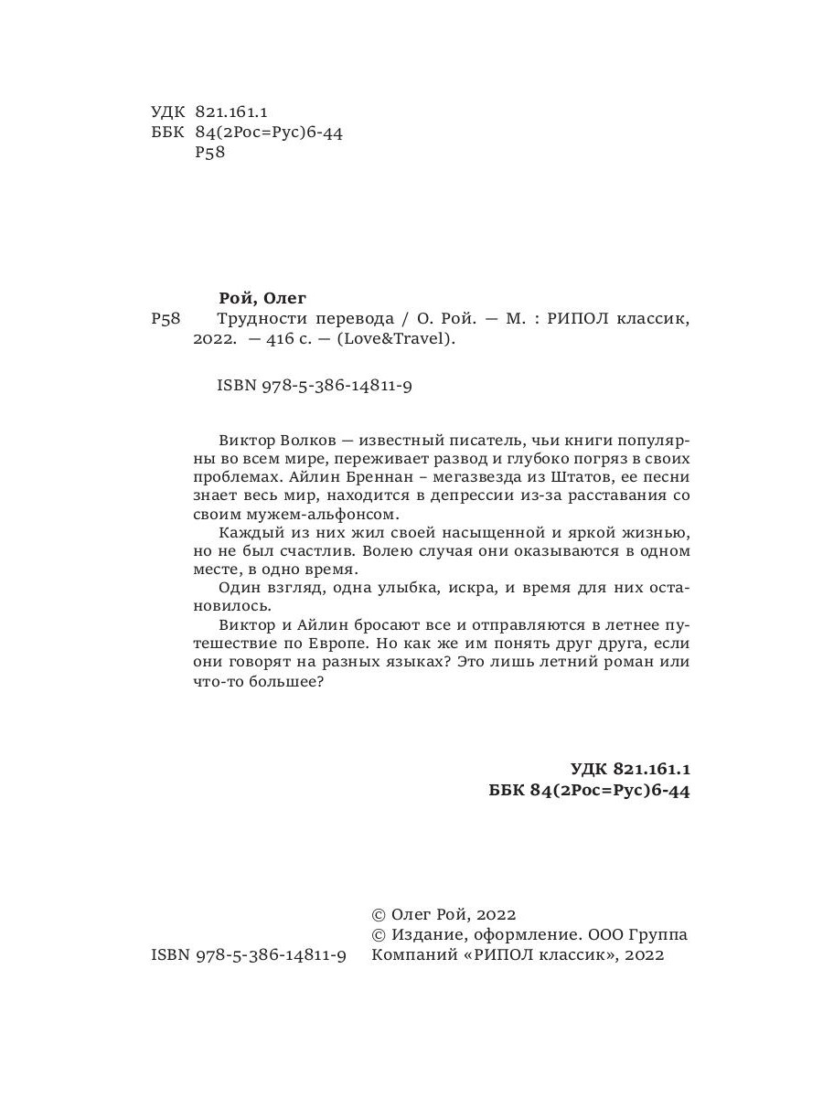 Виктор Волков - известный писатель, чьи книги популярны во всем мире, переживает развод и глубоко погряз в своих проблемах. Айлин Бреннан - мегазвезда из Штатов, ее песни знает весь мир, находится в депрессии из-за расставания со своим мужем-альфонсом. Каждый из них жил своей насыщенной и яркой жизнью, но не был счастлив. Волею случая они оказываются в одном месте, в одно время. Один взгляд, одна улыбка, искра, и время для них остановилось. Виктор и Айлин бросают все и отправляются в летнее путешествие по Европе. Но как же им понять друг друга, если они говорят на разных языках? Это лишь летний роман или что-то большее?| Издательство | Рипол Классик |