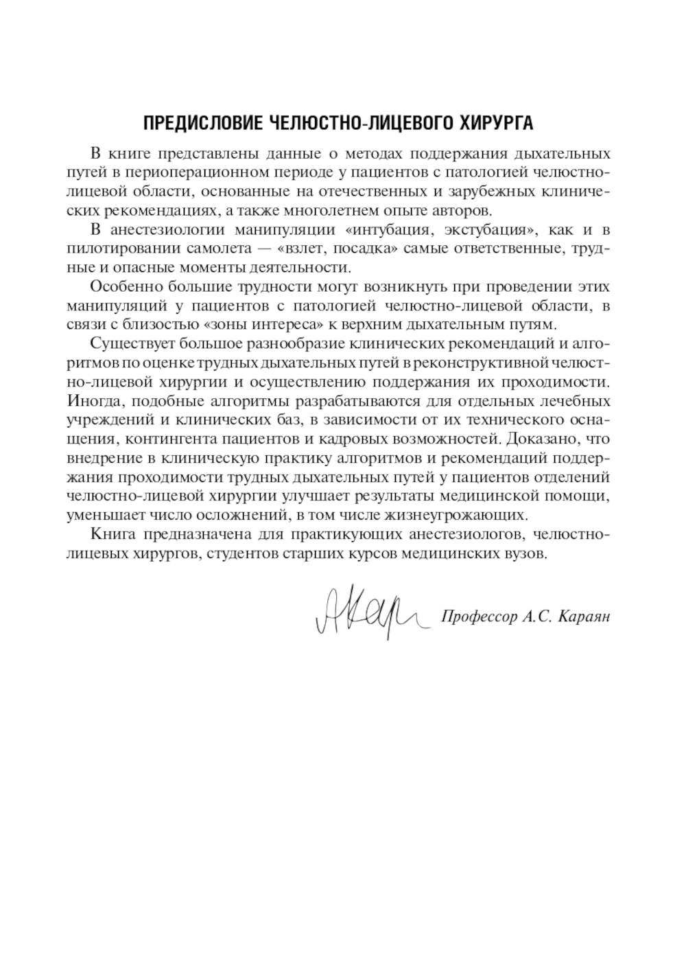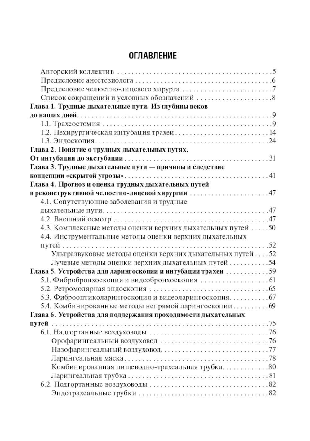 В книге представлены данные о методах поддержания проходимости дыхательных путей в периоперационном периоде у пациентов в челюстно-лицевой хирургии, основанные на отечественных и зарубежных клинических рекомендациях, а также многолетнем опыте авторов. В работе дан авторский анализ понятия "трудные дыхательные пути", приведены методы оценки трудных дыхательных путей, а также впервые представлена концепция "скрытой угрозы" - состояния, при котором риск развития трудной интубации связан с невидимыми при рутинном осмотре анатомическими деформациями или функциональными изменениями. Показаны устройства для поддержания проходимости дыхательных путей - от классических до самых современных, в том числе основанных на видео визуализации. Предложена классификация воздуховодов и раскрыты особенности их применения. Подробно разобрана техника экстубации после реконструктивных челюстно-лицевых операций с выполнением превентивной ларингоскопии, указаны вероятные ошибки и осложнения. Информация дополнена исторической справкой. Текст снабжен наглядным иллюстративным материалом. Издание предназначено практикующим анестезиологам-реаниматологам, челюстно-лицевым и ЛОР-хирургам, студентам старших курсов медицинских вузов.
