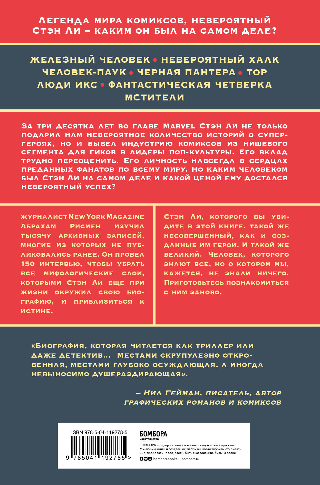 «Биография, которая читается как триллер или даже детектив... Местами скрупулезно откровенная, местами глубоко осуждающая, а иногда невыносимо душераздирающая». - Нил Гейман, писатель, автор графических романов и комиксов Более 25 недель в топах продаж Amazon! Разоблачающая, честная и самая детальная биография человека, создавшего вселенную Marvel. Стэн Ли - одна из самых известных и влиятельных личностей мировой поп-культуры. Его история выглядит как абсолютное воплощение «американской мечты»: пройдя все круги ада «среднего класса», вкалывая на заурядной студии и хватаясь за все возможности, которые видел, он не только добился признания и богатства. Он сделал так, что имя Marvel на слуху у каждого. А Тор, Человек-паук, Невероятный Халк, Черная Пантера, Железный Человек и другие герои комиксов стали новыми супербогами современности с неисчисляемой армией поклонников. При этом о самом Стэне Ли мы не знаем почти ничего. Несмотря на многочисленные мифы вокруг его персоны (многие из которых он сам же и породил). Абрахам Рисмен, журналист изданий New York Magazine, The Washington Post, The Wall Street Journalи др., проделал огромную работу, чтобы написать наиболее честную и приближенную к реальности биографию отца Marvel. Он провел 150 интервью и исследовал тысячу архивных записей, многие из которых не публиковались прежде. Эта книга познакомит вас с настоящим Стэном Ли, который, как и созданные им персонажи, обладал множеством пороков и терзаний. Но несмотря ни на что был великим человеком.| Издательство | ООО "Издательство "Эксмо" |