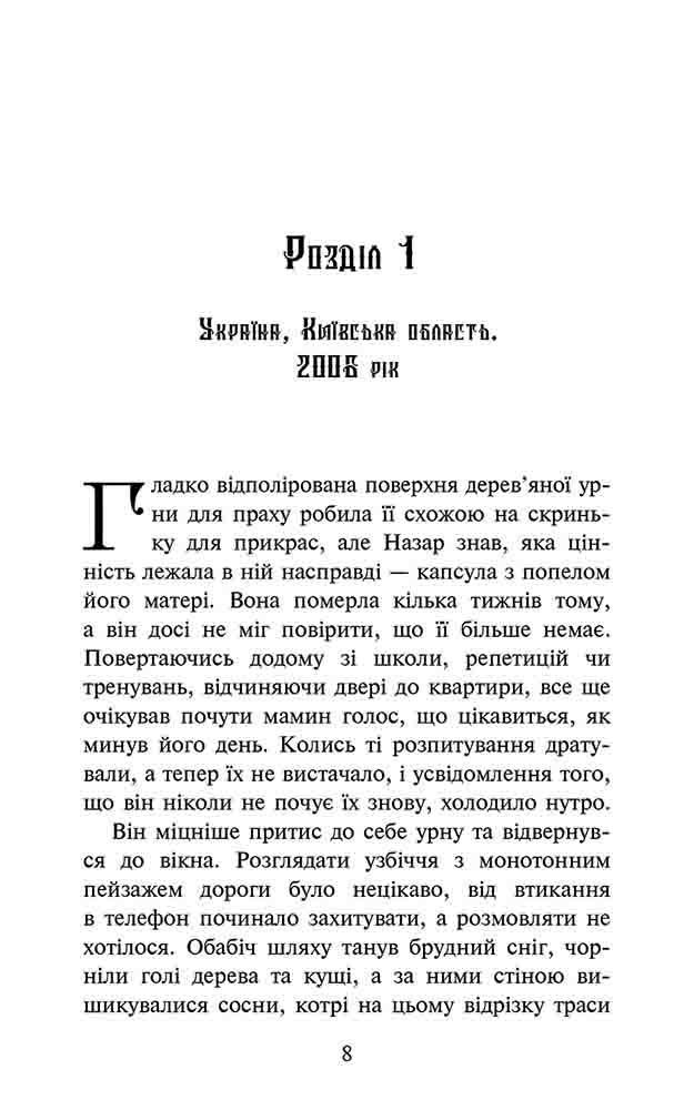 Назарові шістнадцять. Він ходить до школи, займається спортом та грає на гітарі у шкільному гурті. Щоб виконати останню волю померлої матері, хлопець потрапляє в село, де вона виросла. Певні дії призводять до неочікуваних наслідків: життя Назара докорінно змінюється. Отож він змушений терміново звикати до нових реалій, а ще - вивчати історію, магію та спілкуватися з незвичайними людьми і дивними істотами. Чи вийде в Назара розгадати навалу таємниць, розібратися з минулим, що дається взнаки усім родичам, і лишитися неушкодженим? Чому варто прочитати цю книгу: Ця фентезійна історія відбувається на теренах України. Цікавезний сюжет, історичні паралелі, містичні світи, потойбічні істоти, складні родинні стосунки, кохання - все дуже захопливо і динамічно. Книга здобула перемогу в конкурсі «Містичні дивовижі» від літературної платформи «Букнет» Авторка: Авторка про себе: «Описую прожиті людьми реальні історії. Пишу про життєвий шлях моїх друзів і знайомих, з якими свого часу мене звело життя і те, через що вони пройшли - мене вразило... Сподіваюсь, ці історії нікого не залишать байдужими».| ISBN | 978-617-7877-57-7 |