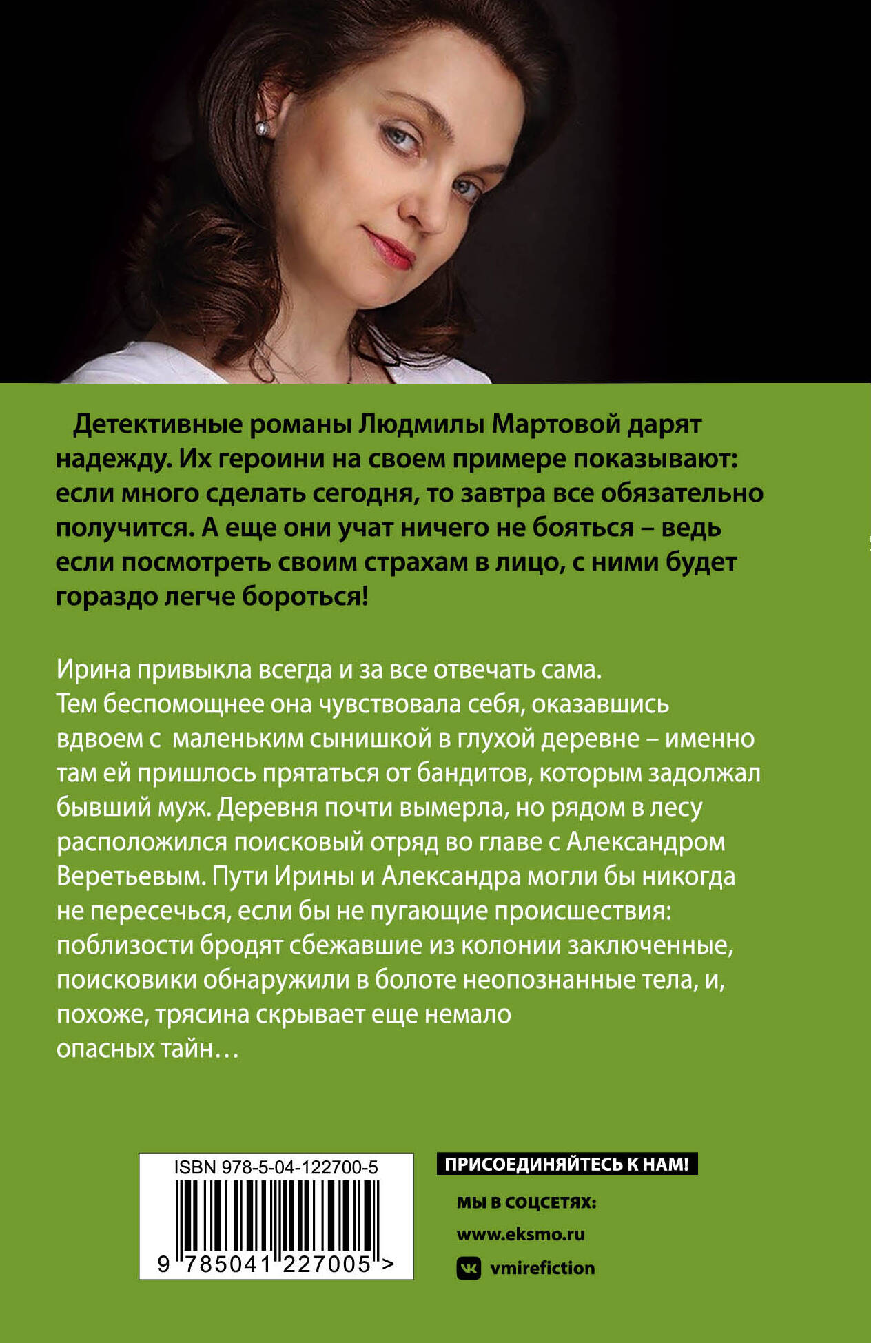 Ирина привыкла всегда и за все отвечать сама. Тем беспомощнее она чувствовала себя, оказавшись вдвоем с маленьким сынишкой в глухой деревне - именно там ей пришлось прятаться от бандитов, которым задолжал бывший муж. Деревня почти вымерла, но рядом в лесу расположился поисковый отряд во главе с Александром Веретьевым. Пути Ирины и Александра могли бы никогда не пересечься, если бы не пугающие происшествия - поблизости бродят сбежавшие из колонии заключенные, поисковики обнаружили в болоте неопознанные тела, и, похоже, трясина скрывает еще немало опасных тайн… Увлекательные любовно-детективные романы Людмилы Мартовой мотивируют читательниц на достижение своих целей и заставляют их поверить в то, что они достойны большего. Автор активно занимается самопродвижением, тиражи стабильно растут, поэтому не поверить ей нельзя. Людмила Мартова - пример для каждой из читательниц, как достичь своей мечты.| Издательство | ООО "Издательство "Эксмо" |