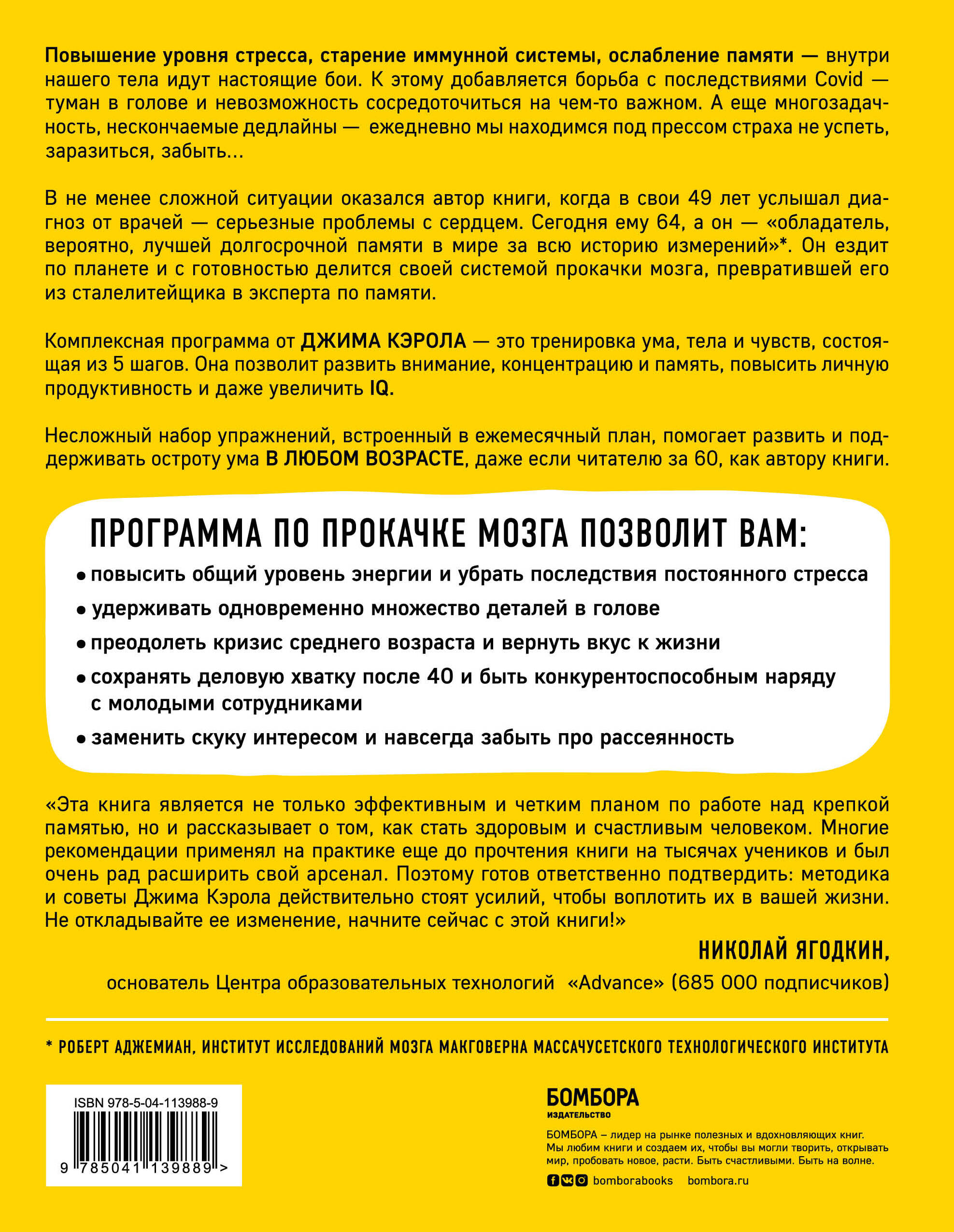 Повышение уровня стресса, старение иммунной системы, ослабление памяти - внутри нашего тела идут настоящие бои. К этому добавляется борьба с последствиями Covid - туман в голове и невозможность сосредоточиться на чем-то важном. А еще многозадачность, нескончаемые дедлайны - ежедневно мы находимся под прессом страха не успеть, заразиться, забыть… В не менее сложной ситуации оказался автор книги, когда в свои 49 лет услышал диагноз от врачей - серьезные проблемы с сердцем. Сегодня ему 64, он - обладатель, вероятно, лучшей долгосрочной памяти в мире за всю историю измерений. Он ездит по планете и с готовностью делится своей системой прокачки мозга, превратившей его из сталелитейщика в эксперты по памяти. Комплексная программа от Джима Кэрола - это тренировка ума, тела и чувств, состоящая из пяти шагов. Она позволит развить внимание, концентрацию и память, повысить личную продуктивность и даже увеличить IQ. Несложный набор упражнений, выстроенный в ежемесячный план, помогает развить и поддерживать остроту ума В ЛЮБОМ ВОЗРАСТЕ, даже если читателю за 60, как автору книги. Программа по прокачке мозга позволит вам: • повысить общий уровень энергии и убрать последствия постоянного стресса, • удерживать одновременно множество деталей в голове, • преодолеть кризис среднего возраста и вернуть вкус к жизни, • сохранять деловую хватку после 40 и быть конкурентоспособным наряду с молодыми сотрудниками, • заменить скуку интересом и навсегда забыть про рассеянность.| Издательство | ООО "Издательство "Эксмо" |