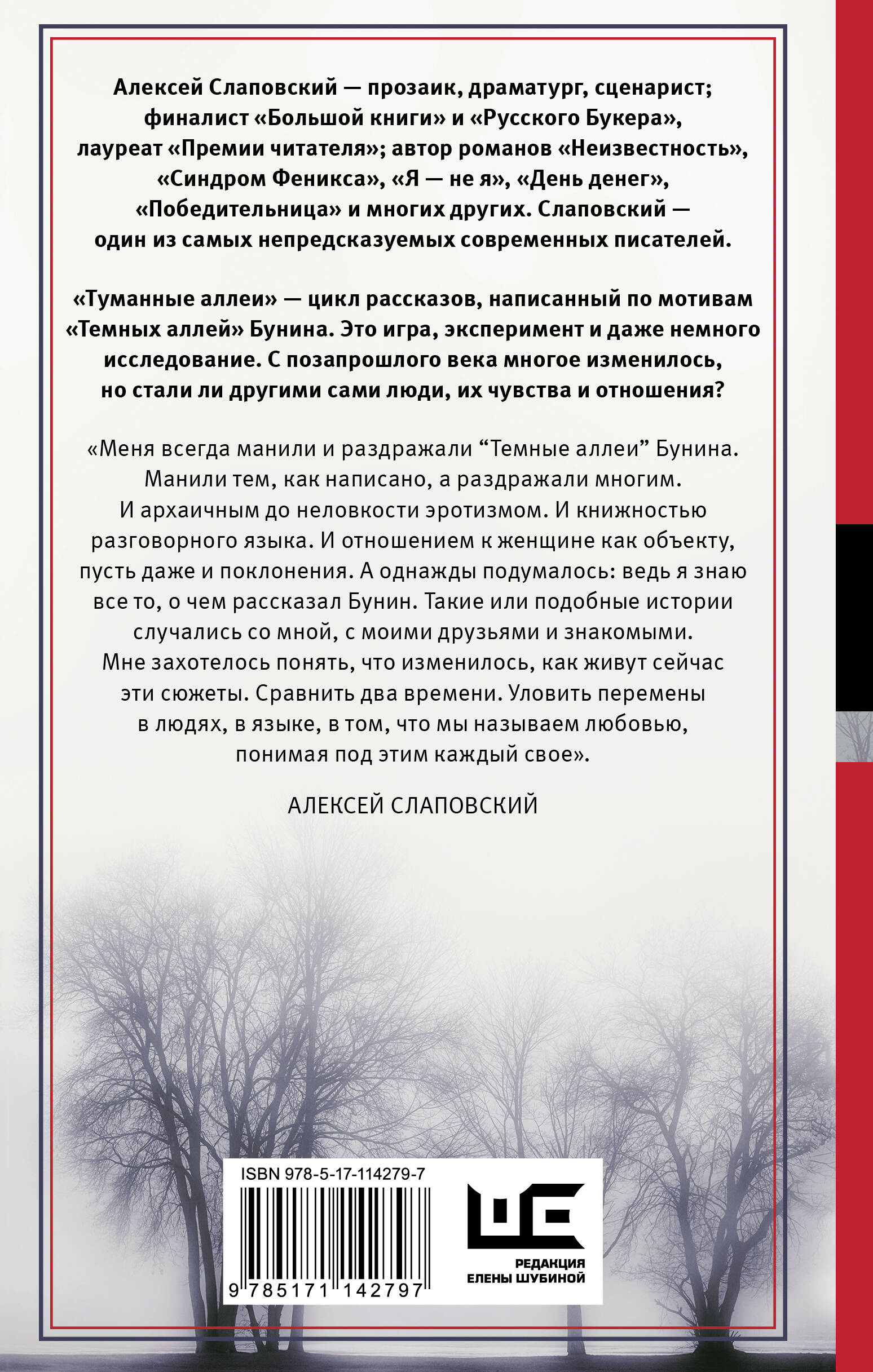 Алексей Слаповский - прозаик, драматург, сценарист; финалист "Большой книги" и "Русского Букера", лауреат "Премии читателя"; автор романов "Неизвестность", "Синдром Феникса", "Я - не я", "День денег", "Победительница" и многих других. Слаповский - один из самых непредсказуемых современных писателей. "Туманные аллеи" - цикл рассказов, написанный по мотивам "Темных аллей" Бунина. Это игра, эксперимент и даже немного исследование. С позапрошлого века многое изменилось, но стали ли другими сами люди, их чувства и отношения? "Меня всегда манили и раздражали "Темные аллеи" Бунина. Манили тем, как написано, а раздражали многим. И архаичным до неловкости эротизмом. И книжностью разговорного языка. И отношением к женщине как объекту, пусть даже и поклонения. А однажды подумалось: ведь я знаю все то, о чем рассказал Бунин. Такие или подобные истории случались со мной, с моими друзьями и знакомыми. Мне захотелось понять, что изменилось, как живут сейчас эти сюжеты. Сравнить два времени. Уловить перемены в людях, в языке, в том, что мы называем любовью, понимая под этим каждый свое". Алексей Слаповский| Издательство | ИЗДАТЕЛЬСТВО "АСТ" |