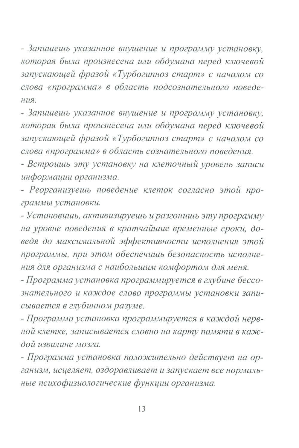 Комплект из 4-х книг, посвещенных техникам турбо-гипноза. Автоматизированная система программирования подсознания «ТурбоГипноз» - это инструмент, с помощью которого вы можете реализовать свои намерения от улучшения поведения и личностных характеристик до реализации глобальных материальных и духовных желаний. Система позволяет быстро встраивать в себя желаемые программы и установки с помощью текстовых готовых моделей и алгоритмов. В этом руководстве вы получите готовые программы-инсталляторы для подсознания «Турбогипноз», «Самогипноз», инструкции по работе с ними и интеграции в себя любых установок, получите набор базовых установок на уверенность и общее улучшение здоровья, программу-инсталятор «Чистка» для снятия и деинсталляции негативных программ и установок, готовые гипнопротоколы на память, сосредоточенность, уверенность в себе, для зарабатывания большего количества денег, алгоритм создания своих гипнопротоколов, обучение с помощью системы, моделирование, снятие и интеграция в себя положительных качеств других людей, психофармакалогия с примерами на основе «Аспирина» и «Анальгина», включение гормонов с гипнопротоколом «Тестостерон», а также информация о применении технологии для реализации своих желаний и намерений ваших клиентов.