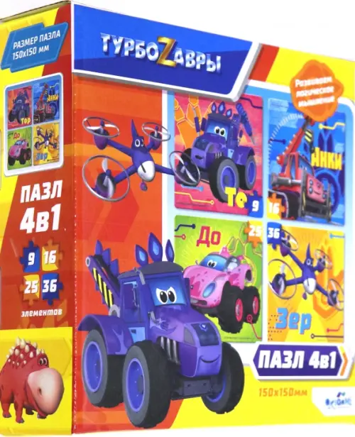 Набор пазлов 4в1 - это комплект пазлов с разной элементностью, включающий в себя головоломки из 9, 16, 25, 36 элементов, объединенных общей тематикой. Это необычная коллекция картинок с изображением любимых персонажей мультфильма "Турбозавры", которая понравится любому ребенку. Соберите всю коллекцию и окунитесь в новое приключение вместе с известными героями. Постепенно усложняя сборку пазла от 9 элементов до 36 элементов, ребенок научится внимательности, концентрации, а также сможет развить мелкую моторику.