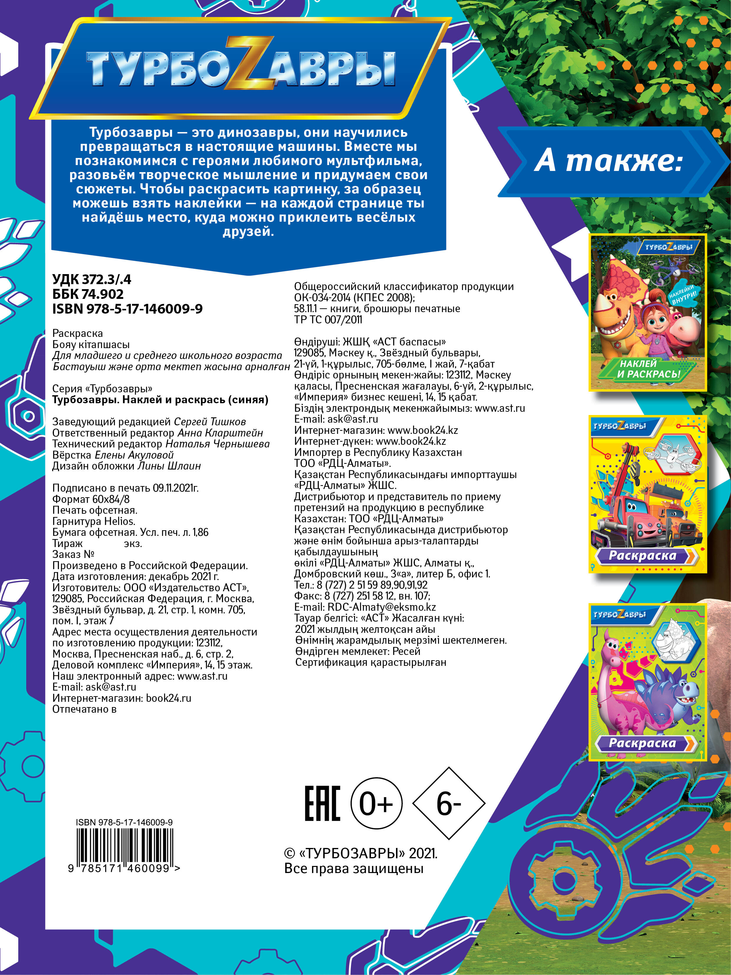 Турбозавры - это динозавры, они научились превращаться в настоящие машины. Вместе мы познакомимся с героями любимого мультфильма, разовьём творческое мышление и придумаем свои сюжеты. Чтобы раскрасить картинку, за образец можешь взять наклейки - на каждой странице ты найдёшь место, куда можно приклеить весёлых друзей.| Издательство | Издательство "АСТ" |