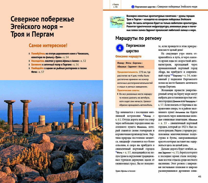 С помощью путеводителя вы совершите путешествие по северному побережью Эгейского моря, где находились два самых известных античных города Троя и Пергам, познакомитесь с Ликийским побережьем и античным городом сказочно богатого царя Креза, пройдете по следам войска Александра Македонского, а еще - увидите традиционные турецкие деревни и позагораете под лучами ласкового солнца на знаменитом пляже Олюдениз, сможете потанцевать на всемирно известной дискотеке «Галикарнас» в Бодруме.