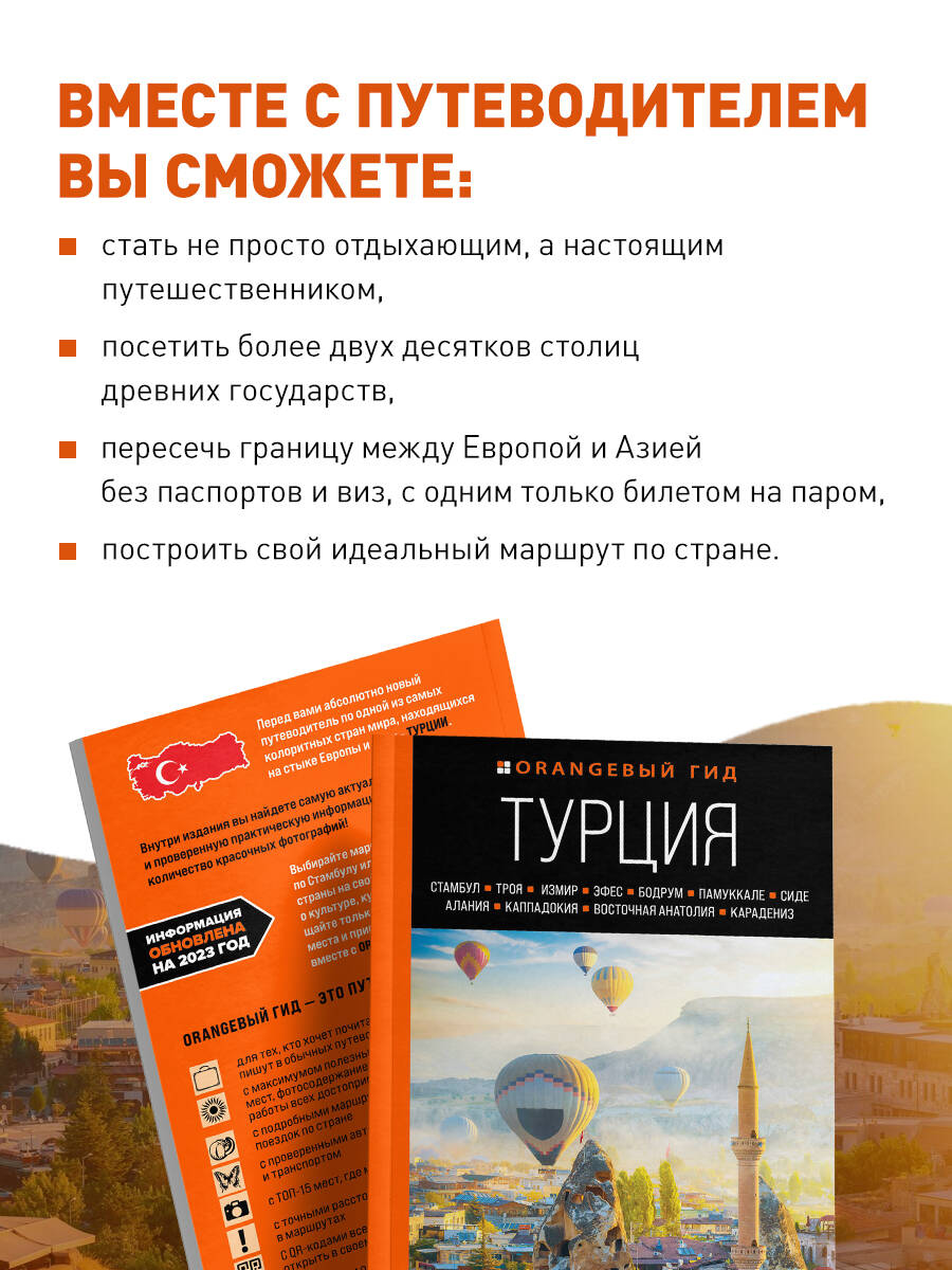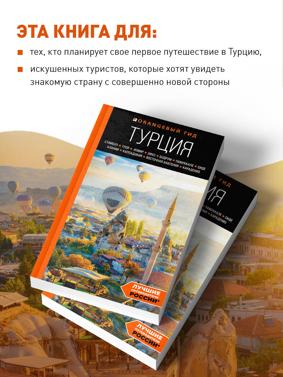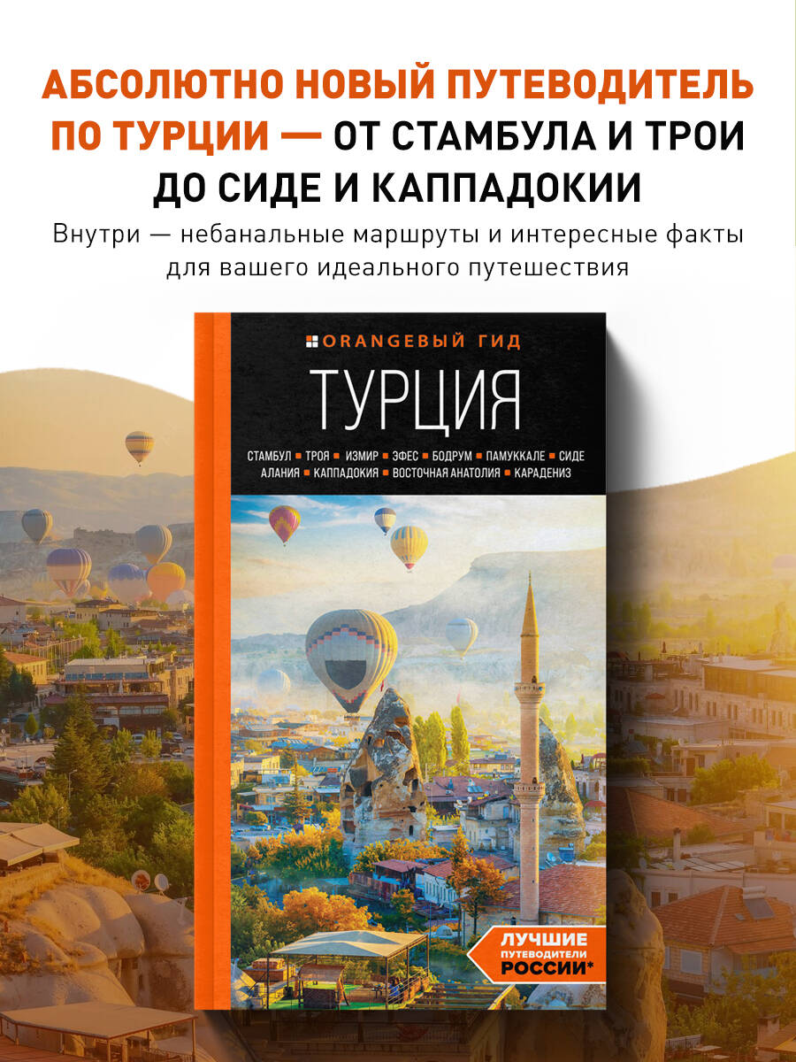 Путеводитель знаменитой серии «Оранжевый гид» по Турции! Вместе с нашим гидом вы изучите столицу четырех империй Стамбул и руины знаменитого города Трои, о которой писал Гомер, побываете в Эгейской Турции и в затерянных мирах Каппадокии, поднимитесь на гору Арарат и искупаетесь в белоснежных травертинах Памуккале, а также попробуете вкуснейшую местную кухню и изучите традиции местных жителей. Измир, Сиде, Алания, Бодрум, Фетхие, Анталья - все эти города и многие другие ждут вас в нашем путеводителе! Только актуальная информация, маршруты прогулок и поездок, интересные факты, красочные фотографии - все для того, чтобы вы могли спланировать свое идеальное путешествие в страну, которая находится между Европой и Азией!| Издательство | ООО "Издательство "Эксмо" |