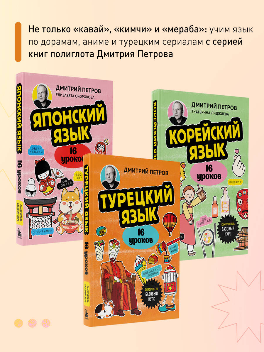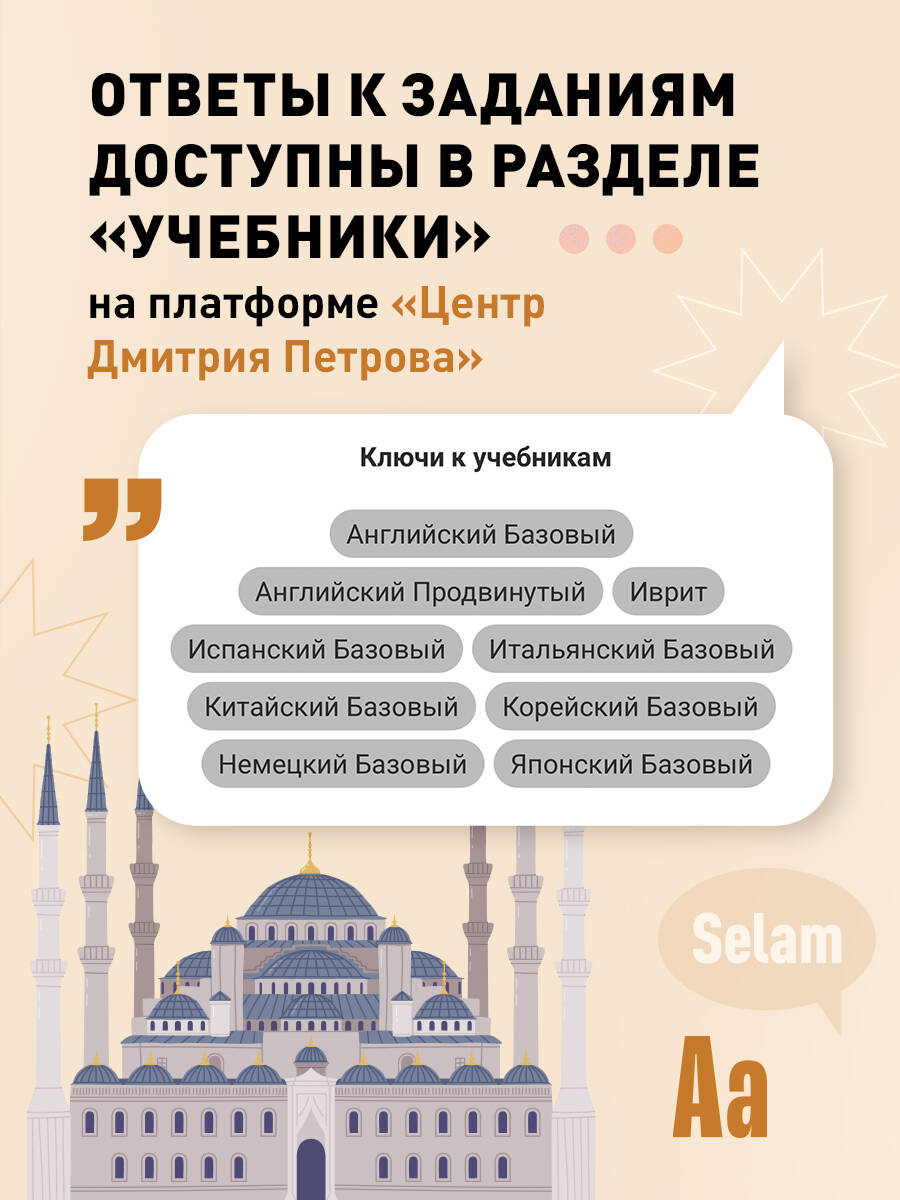 Смотреть в оригинале «Великолепный век» и «Черную любовь». Уверенно торговаться на рынке и сойти за местного в любом кафе. Наконец, понять, что означает знаменитое "shikidim" певца Таркана. Все это возможно, если знать турецкий. Самоучитель Дмитрия Петрова позволит вам сделать первый шаг к пониманию, о чем постоянно спорят прагматичный Серкан и эмоциональная Эда и как подозвать милого кота на улицах Стамбула. С этой книгой вы легко погрузитесь в изучение нового языка и культуру Турции. Всего за 16 уроков вы освоите: • правила чтения и ударения; • основную грамматику языка; • написание чисел, дат и времени; • спряжения и времена глаголов; • и многое другое.| Издательство | ООО "Издательство "Эксмо" |