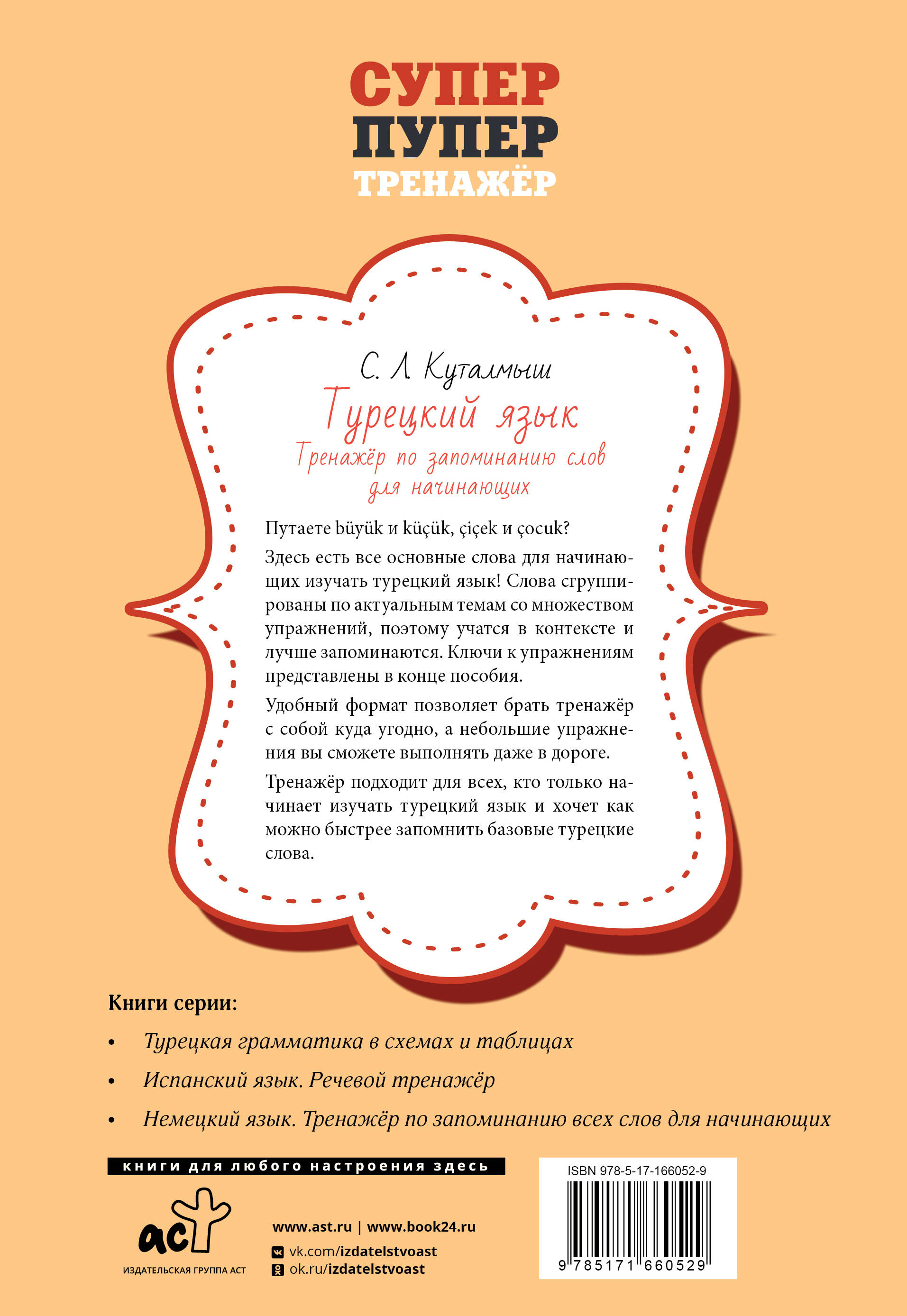 Путаете büyük и küçük, çiçek и çocuk? Здесь есть все основные слова для начинающих изучать турецкий язык! Слова сгруппированы по актуальным темам со множеством упражнений, поэтому учатся в контексте и лучше запоминаются. Ключи к упражнениям представлены в конце пособия. Удобный формат позволяет брать тренажер с собой куда угодно, а небольшие упражнения вы сможете выполнять даже в дороге. Тренажер подходит для всех, кто только начинает изучать турецкий язык и хочет как можно быстрее запомнить базовые турецкие слова.| Издательство | Издательство "АСТ" |