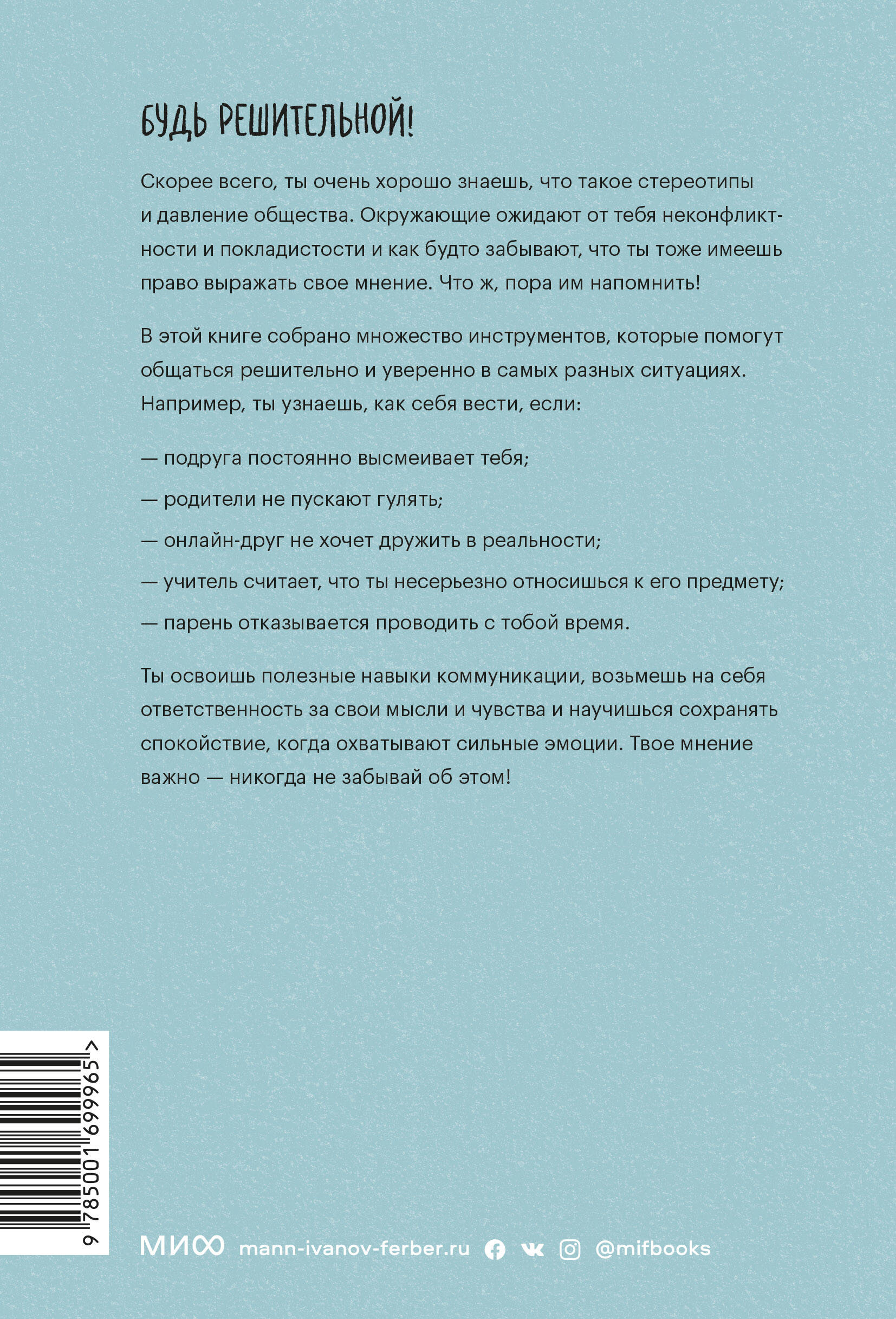 Обладатель награды INDIEFAB "Книга года" в категории "Лучший молодежный нонфикшн". Быть девочкой-подростком непросто, ключ к успеху - чувствовать себя уверенно и уметь защищать свою точку зрения. Психотерапевт Эмили Робертс научит девочку эффективно общаться в любой ситуации. В сети или в школе, с друзьями, родителями, хулиганами, группами или возлюбленными - ей будет под силу справиться с любыми обстоятельствами. Многие девочки-подростки вынуждены вести себя хорошо, а не отстаивать свое мнение. Возможно, они боятся, что если будут настаивать на своем, их обвинят в желании командовать или чрезмерной агрессии. Однако когда приходится молчать, то наверняка после этого ты неважно себя чувствуешь. Эта книга поможет снова и снова попадать в одну и ту же ловушку. Она объяснит девочке, что ее мысли и чувства имеют такое же значение, как мысли и чувства других - просто нужно обрести голос. Благодаря этому практическому руководству девочки освоят навыки, основанные на диалектической поведенческой терапии (ДБТ) и когнитивно-поведенческой терапии (КПТ). Они помогут им улучшить взаимодействие с окружающими и справиться со сложными эмоциями, которые могут возникнуть из-за запугивания или общения с неприятными людьми. В книге также представлены простые стратегии, которые повысят уверенность в себе, и коммуникативные приемы, которые можно использовать каждый день: в том числе как говорить, когда вы расстроены, спрашивать, чего хочет от вас собеседник, и справляться с сильными эмоциями. В современном мире социальных сетей и текстовых сообщений сильные коммуникативные навыки необходимы как никогда. В этой книге девочки найдут инструменты, необходимые для общения как в реальной жизни, так и в онлайне. Основные преимущества всех тетрадей серии: - научно-доказательная база; - практическая направленность; - интересные упражнения, обращенные непосредственно к подростку; - практически мгновенный эффект; - авторы - ведущие психотерапевты, признанные эксперты в своих областях. Для кого книга: Для девочек-подростков. Для родителей, педагогов и психологов.| Издательство | МАНН, ИВАНОВ И ФЕРБЕР ООО |