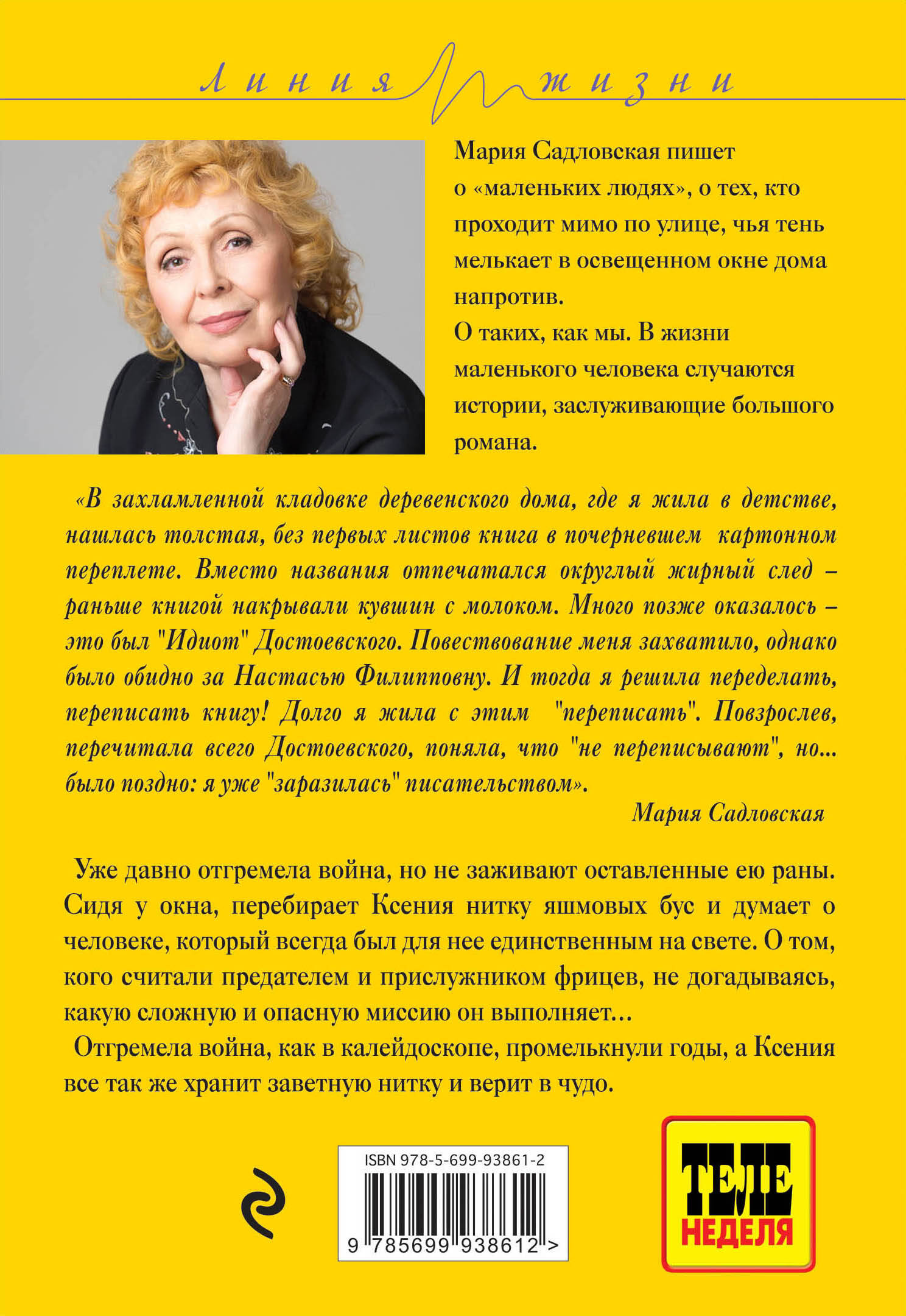 О чем Сборник рассказов Марии Садловской «Твоя любовь сильнее смерти» о людях, которые прошли испытание войной, предательством, временем, но не растеряли своих душевных качеств. В центре книги рассказ под названием «Яшмовые бусы», в основу которого положена реальная история - история любви, для которой не существует преград. Ни политические коллизии, ни проверка расстоянием, ни долгие годы в разлуке не смогли охладить страсть и любовь, нежность и сильные чувства влюбленных, они, словно нить яшмовых бус, были навсегда связаны вместе. Жанр Психологическая проза. Почему стоит прочитать Невероятно трогательные, нежные, живые и яркие истории не оставят равнодушными никого. Психологическая проза Марии Садловской полна лиризма и трагизма одновременно. Она подкупает искренностью, эмоциональностью и жизненностью. Отзыв читателя «Произведения этого автора стали для меня литературным открытием. Душевность, простота повествования и хороший литературный язык доставили большое удовольствие от прочтения. Обязательно прочту другие ее книги».| Издательство | ООО "Издательство "Эксмо" |