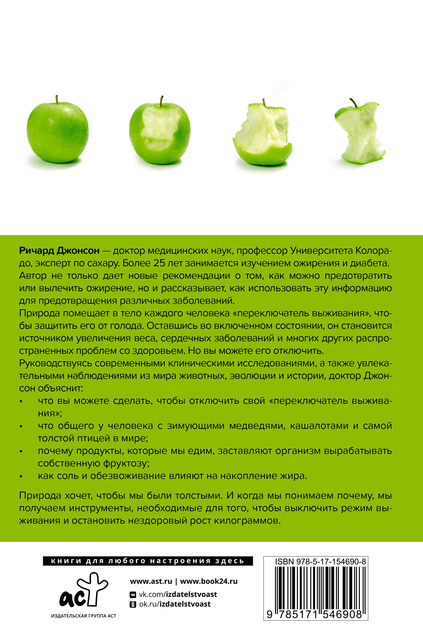 Ричард Джонсон - доктор медицинских наук, профессор Университета Колорадо, эксперт по сахару. Более 25 лет занимается изучением ожирения и диабета. Автор не только дает новые рекомендации о том, как можно предотвратить или вылечить ожирение, но и рассказывает, как использовать эту информацию для предотвращения различных заболеваний. Природа помещает в тело каждого человека "переключатель выживания", чтобы защитить его от голода. Оставшись во включенном состоянии, он становится источником увеличения веса, сердечных заболеваний и многих других распространенных проблем со здоровьем. Но вы можете его отключить. Руководствуясь современными клиническими исследованиями, а также увлекательными наблюдениями из мира животных, эволюции и истории, доктор Джонсон объяснит: • что вы можете сделать, чтобы отключить свой "переключатель выживания"; • что общего у человека с зимующими медведями, кашалотами и самой толстой птицей в мире; • почему продукты, которые мы едим, заставляют организм вырабатывать собственную фруктозу; • как соль и обезвоживание влияют на накопление жира. Природа хочет, чтобы мы были толстыми. И когда мы понимаем почему, мы получаем инструменты, необходимые для того, чтобы выключить режим выживания и остановить нездоровый рост килограммов.| Издательство | Издательство "АСТ" |