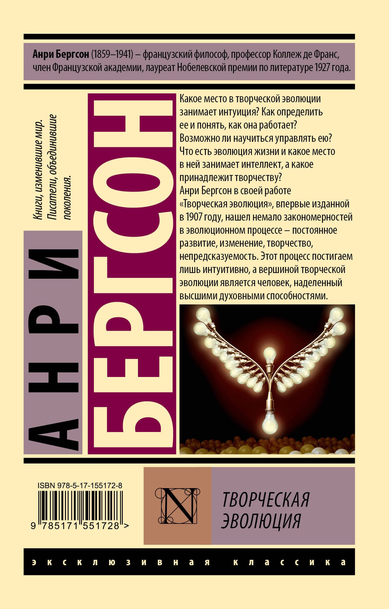 Анри Бергсон (1859-1941) - французский философ, профессор Коллеж де Франс, член Французской академии, лауреат Нобелевской премии по литературе 1927 года. Какое место в творческой эволюции занимает интуиция? Как определить ее и понять, как она работает? Возможно ли научиться управлять ею? Что есть эволюция жизни и какое место в ней занимает интеллект, а какое принадлежит творчеству? Анри Бергсон в своей работе "Творческая эволюция", впервые изданной в 1907 году, нашел немало закономерностей в эволюционном процессе - постоянное развитие, изменение, творчество, непредсказуемость. Этот процесс постигаем лишь интуитивно, а вершиной творческой эволюции является человек, наделенный высшими духовными способностями.| Издательство | ИЗДАТЕЛЬСТВО "АСТ" |