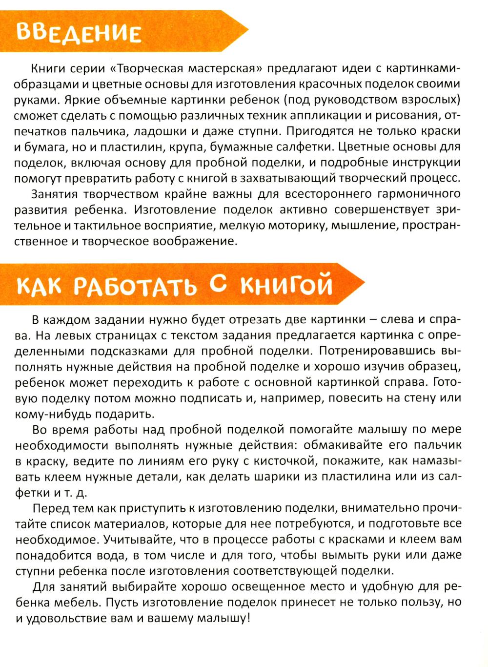 Книги серии «Творческая мастерская» предлагают ребенку создать красочные поделки своими руками. Яркие объемные картинки можно сделать с помощью аппликации, различных техник рисования, отпечатков пальчика или ладошки и т. д. Пригодятся не только краски и бумага, но и пластилин, крупа и даже бумажные салфетки. Цветные основы для поделок, включая основу для пробной поделки, и подробные инструкции помогут увлечь малыша этим полезным развивающим занятием и превратить его в захватывающий творческий процесс.| Издательство | Харвест |