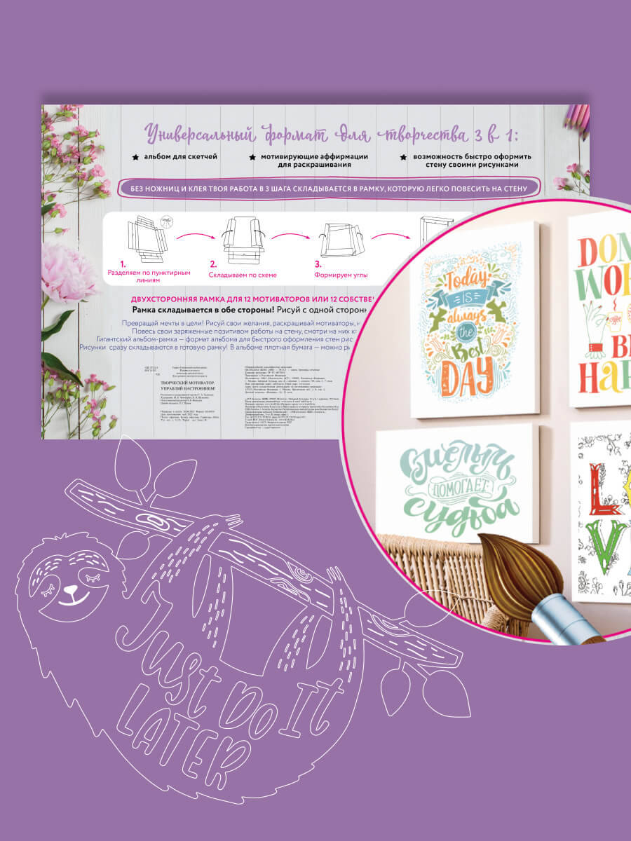 Альбом для творчества, в котором каждый лист превращается в рамку! Универсальный формат для творчества 3 в 1: • альбом для скетчей • мотивирующие аффирмации для раскрашивания • возможность быстро оформить стену своими рисунками Без ножниц и клея твоя работа в 3 шага складывается в рамку, которую легко повесить на стену. Двухсторонняя рамка для 12 мотиваторов или 12 собственных рисунков. Выбирай! Рамка складывается в обе стороны! Рисуй с одной стороны или раскрашивай с другой. В альбоме плотная бумага - можно рисовать фломастерами, гелиевыми ручками, карандашами.| Издательство | АСТ |