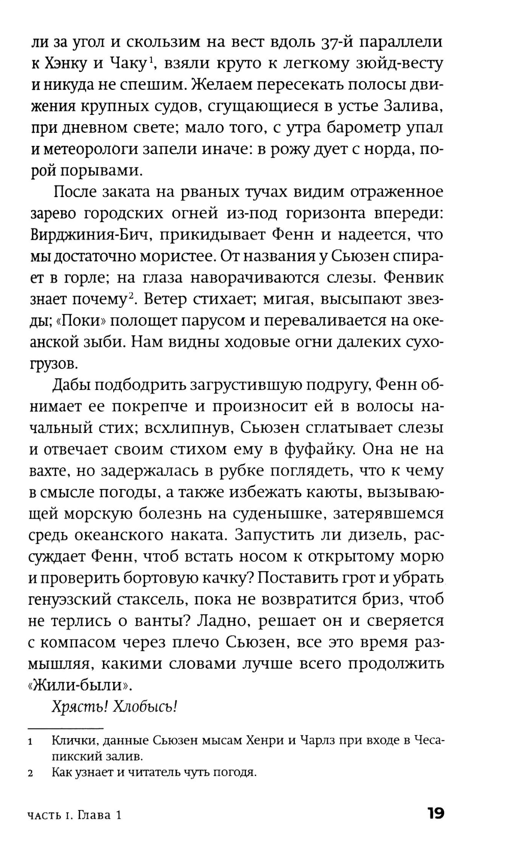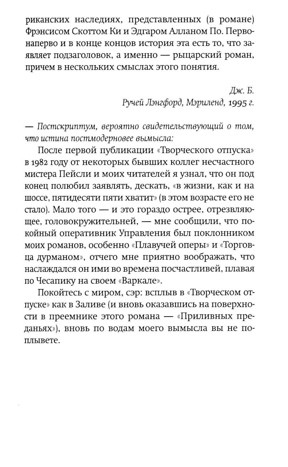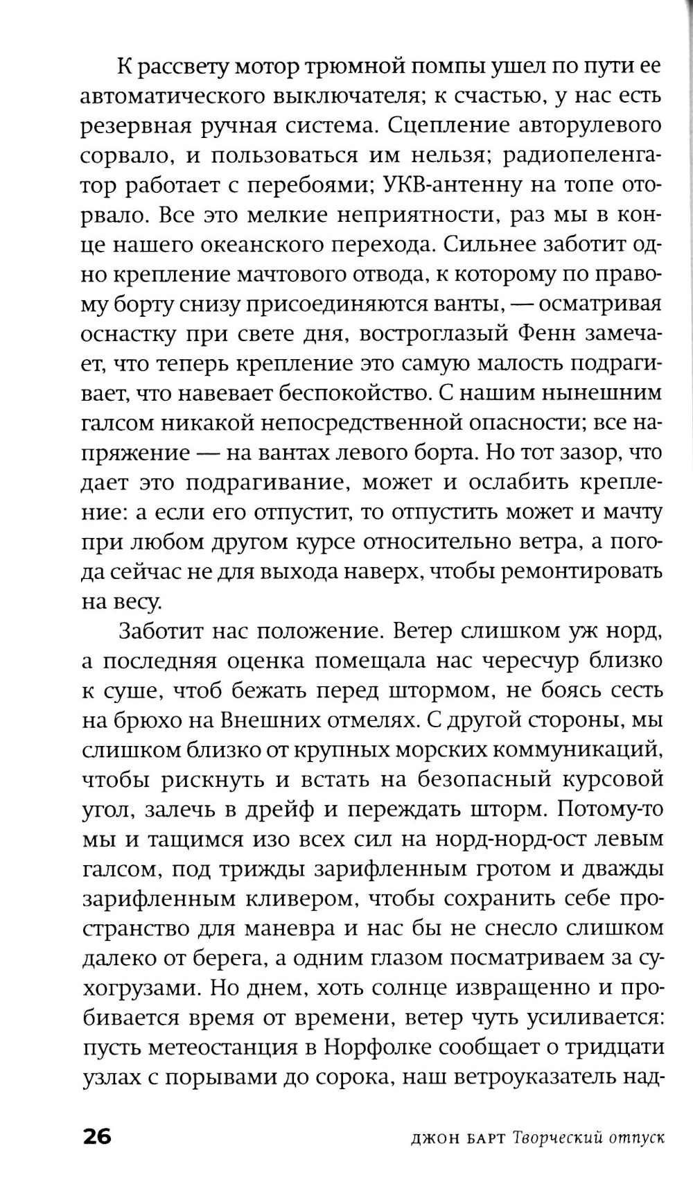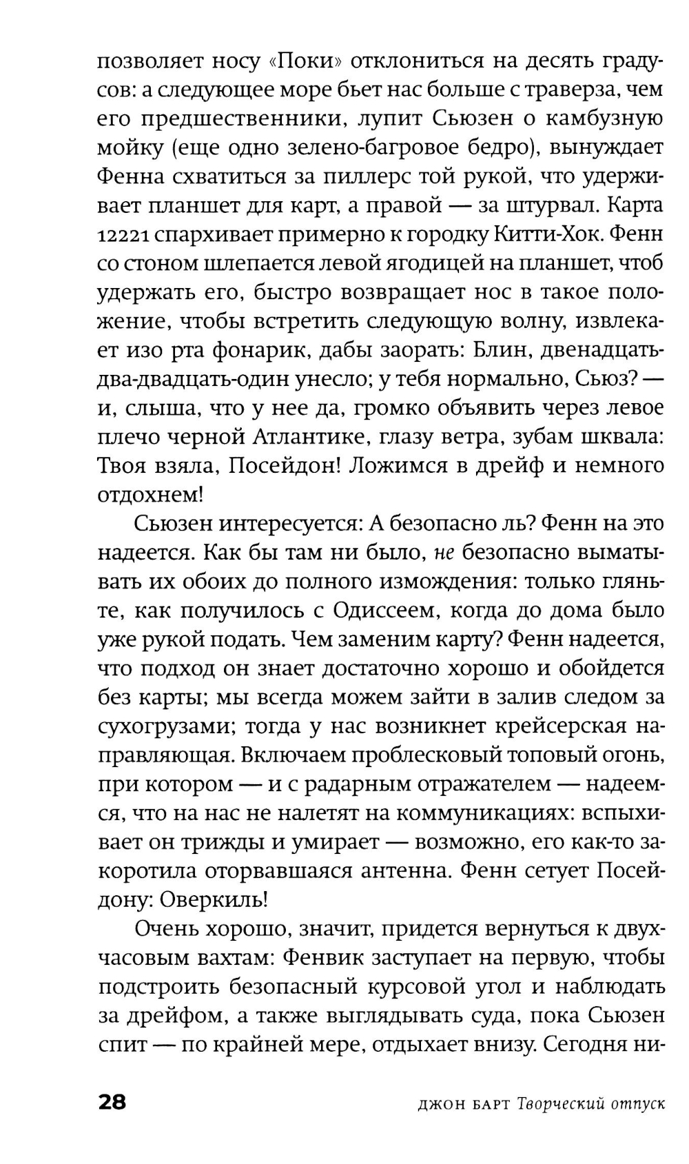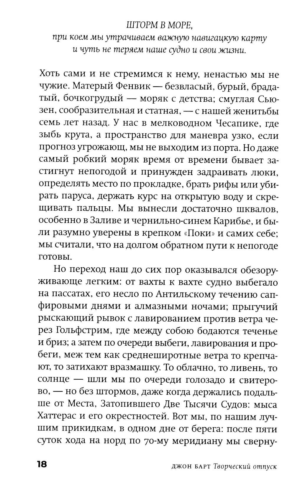 Американскому постмодернисту Джону Барту (р. 1930) в русскоязычном пространстве повезло больше многих, но это неточно. Изданы переводы трех его ранних романов и одного позднего, хотя два его классических шедевра фабулистики - «Торговец дурманом» и «Козлик Джайлз» - еще ждут своих переводчиков и издателей. Сам Барт уже давно и заслуженно легендарен: он член Американской академии искусств и словесности и у него под десяток американских и европейских призов и наград (из них три - по совокупности заслуг и за вклад в современную литературу). Бывший служащий ЦРУ Фенвик Скотт Ки Тернер - возможно, прямой потомок автора гимна США, написавший разоблачительную книгу о своих прежних работодателях, - и его молодая жена - преподавательница американской классической литературы Сьюзен Рейчел Аллан Секлер, полуеврейка-полуцыганка и, возможно, потомица Эдгара Аллана По, - возвращаются в Чесапикский залив из романтического плавания к Карибам. По дороге они, в общем, сочиняют роман (есть версия, что он стал следующим романом самого Джона Барта), сталкиваются с разнообразными морскими приключениями и выбираются из всевозможных передряг. Их ждут бури, морские чудовища, зловещие острова - а над всем нависает мрачная тень этих самых работодателей Фенвика... Сплетенный сразу из всех характерных и любимых деталей творческого почерка Джона Барта, роман скучать читателю точно не дает. Удивителен он тем, что, по сути, отнюдь не тот «умный» или «интеллектуальный» роман, чего вроде бы ждешь от авторов такого калибра и поколения, вроде Пинчона, Хоукса и Бартелми, с которыми русскоязычному читателю традиционно «трудно». Это, скорее, простая жанровая семейная сага плюс, конечно, любовный роман, но написан он с применением постмодернистского инструментария и всего, что обычно валяется на полу мастерской. А поскольку мастерская у нас - все-таки писательская, то и роман получился весьма филологический. И камерный - это, в общем, идеальная пьеса со спецэффектами: дуэт главных героев и небольшая вспомогательная труппа проживают у нас на глазах примерно две недели, ни разу не заставив читателя (подглядывающего зрителя) усомниться в том, что они реальны... Ну и, чтобы и дальше обходиться без спойлеров, следует сказать лишь еще об одной черте романа - о вписанности текста в территорию (вернее, акваторию: не карту, заметим, хотя иметь представление о складках местности не повредит). Тут уж сам Чесапикский залив - одно из тех мест, которые, конечно, можно читать как книгу. Плавание по этим местам будет вполне плавным, но извилистым.| Издательство | Фантом Пресс |