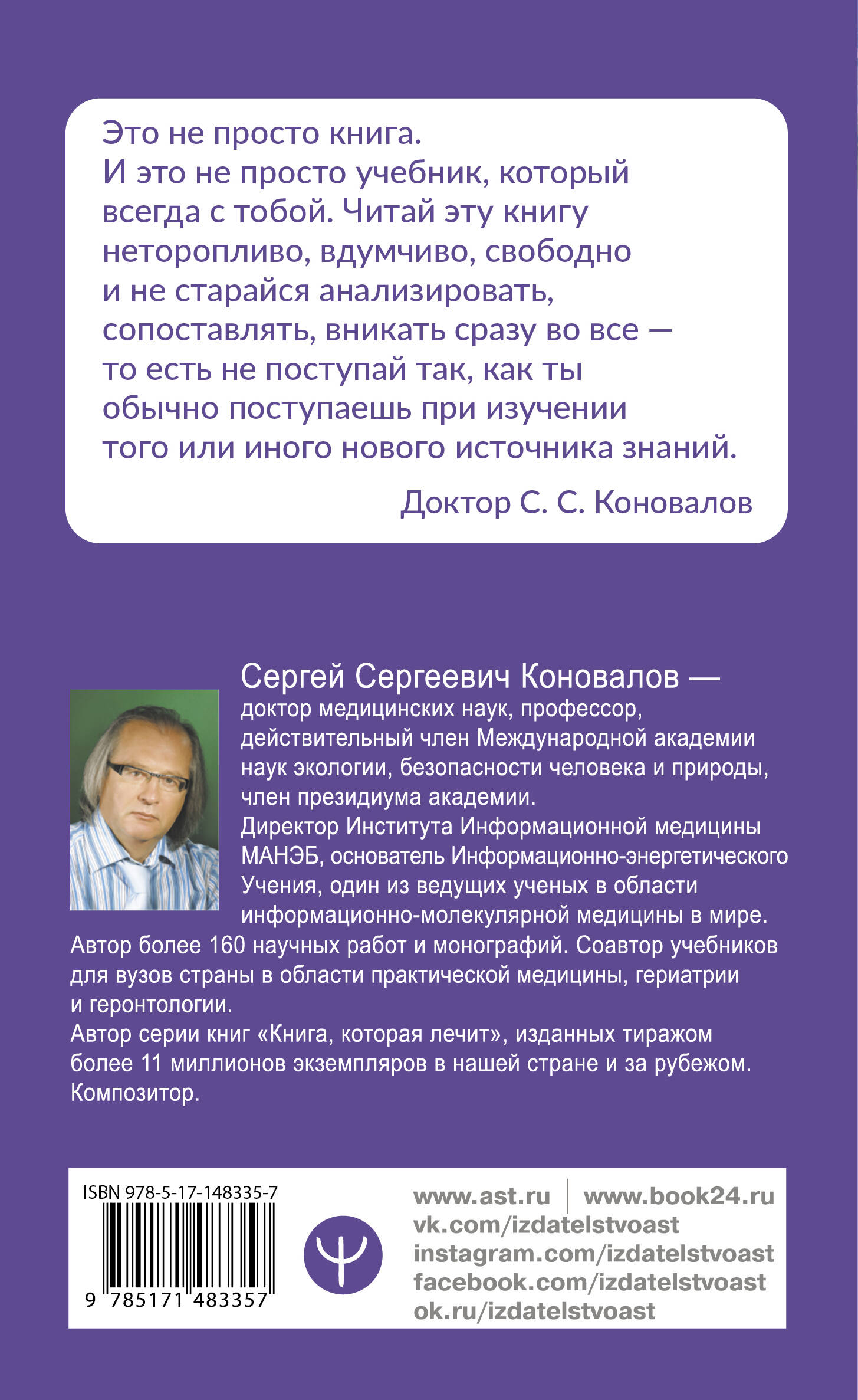 Книга автора Информационно-энергетического Учения С. С. Коновалова «Творение Мира. Реализация замысла. Воплощение. Человек» содержит уникальную информацию о творении Вселенной и реализации замысла Творения Человека. На страницах книги профессора Коновалова вы найдете сведения об Энергии сотворения, устройстве организма человека, роли Информационных полей в сохранении здоровья и истинных причинах развития заболеваний. В этой книге Доктор С. С. Коновалов открывает нам законы устройства Вселенной и всего живого мира, рассказывает о происхождении человека, а также дает рекомендации по сохранению здоровья и избавления от заболеваний.| Издательство | АСТ |