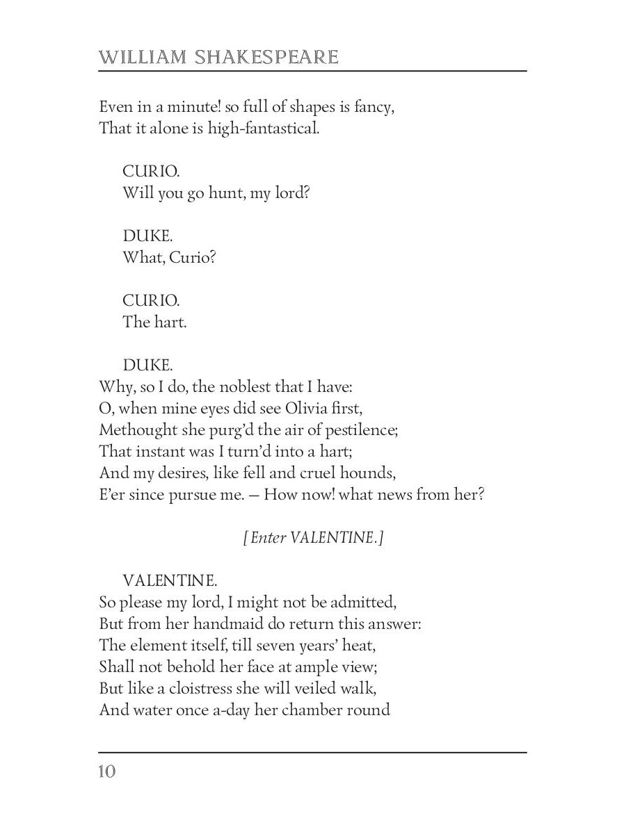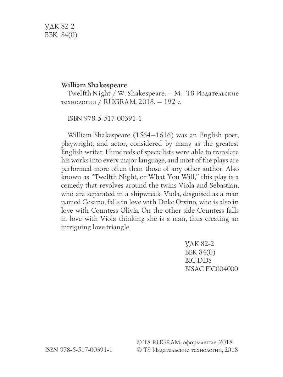 William Shakespeare (1564-1616) was an English poet, playwright, and actor, considered by many as the greatest English writer. Hundreds of specialists were able to translate his works into every major language, and most of the plays are performed more often than those of any other author. Also known as "Twelfth Night, or What You Will" this play is a comedy that revolves around the twins Viola and Sebastian, who are separated in a shipwreck. Viola, disguised as a man named Cesario, falls in love with Duke Orsino, who is also in love with Countess Olivia. On the other side Countess falls in love with Viola thinking she is a man, thus creating an intriguing love triangle.