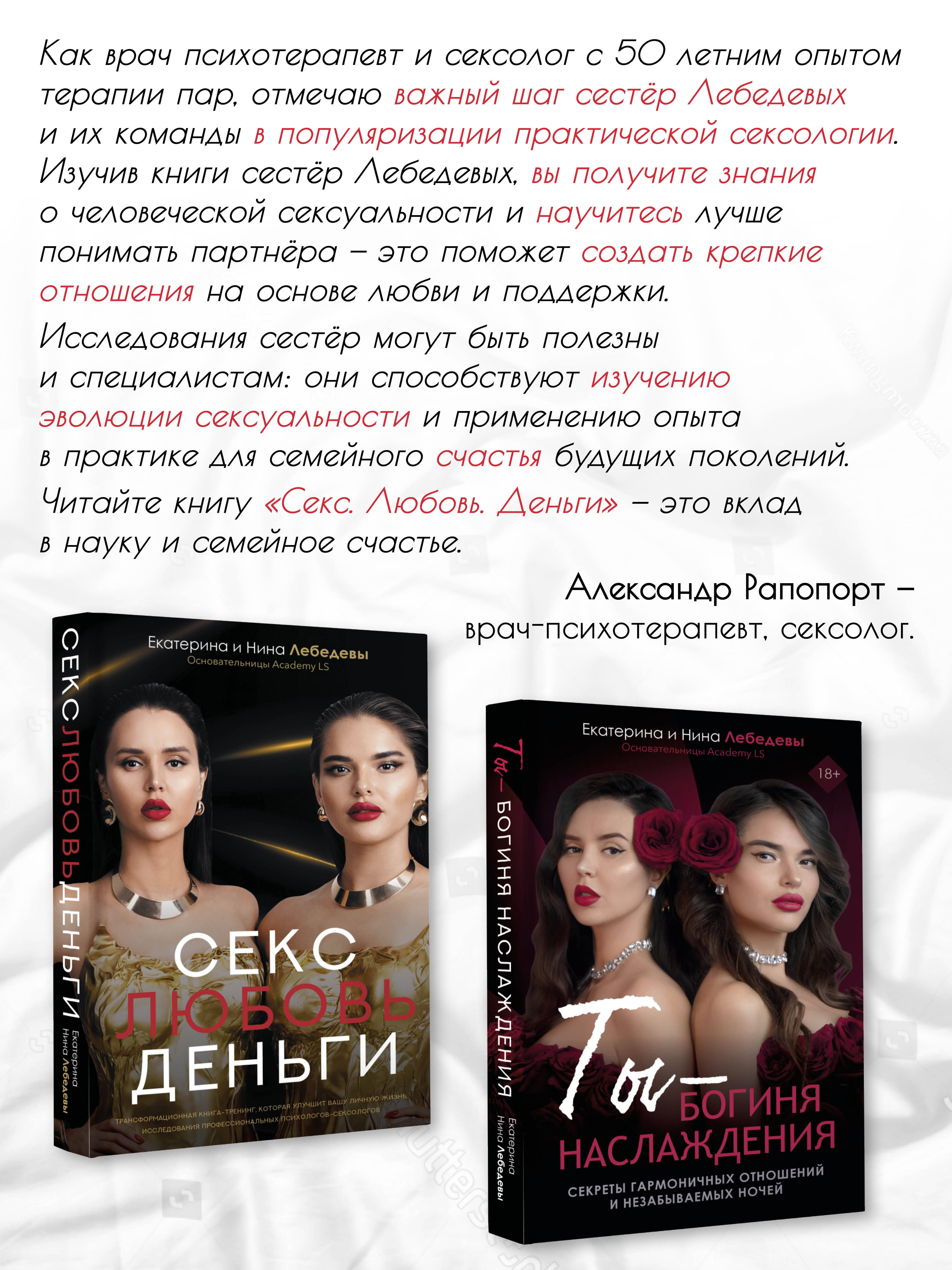 Екатерина и Нина Лебедевы - эксперты по счастливым отношениям, которые в 2013 году основали Academy LS, международную академию семейного и сексуального образования, благодаря которой, более 500 700 выпускников улучшили личную жизнь и реализовались в профессии. Хотите отношений, полных страсти и взаимопонимания? Готовы раскрыть свой чувственный потенциал и вывести близость на новый уровень? Эта книга - ваш мощный инструмент для трансформации личной жизни! * Соблазнение без усилий: овладейте искусством флирта и узнайте, как привлекать внимание нужного человека без лишних усилий. * Крепкие отношения на долгие годы: раскройте секреты построения гармоничного союза, который будет радовать вас каждый день. * Верните искру: узнайте, почему пропадает сексуальное влечение, и получите действенные техники для возвращения страсти и близости. * Тело - источник наслаждения: откройте для себя эрогенные зоны и освойте техники, которые подарят вам и вашему партнёру незабываемые ощущения. * Перезагрузите интим: погрузитесь в мир игр, которые разбудят вашу фантазию и добавят остроты в отношения. * Гармония тела и души: почувствуйте силу тантрического массажа, который поможет снять напряжение, достичь душевного равновесия и укрепить связь с партнером на глубоком уровне. Откройте дверь в мир чувственных экспериментов! Эта книга станет вашим проводником к пробуждению страсти, укреплению любви и истинному наслаждению каждым мгновением близости. Здесь вы найдете ключи к гармонии в отношениях, раскроете безграничные возможности для эротического самопознания и постигнете сокровенные секреты совершенной близости, которыми с вами поделятся опытные эксперты. Позвольте себе погрузиться в этот чувственный водоворот и пережить незабываемые эмоции.| Издательство | Издательство "АСТ" |
