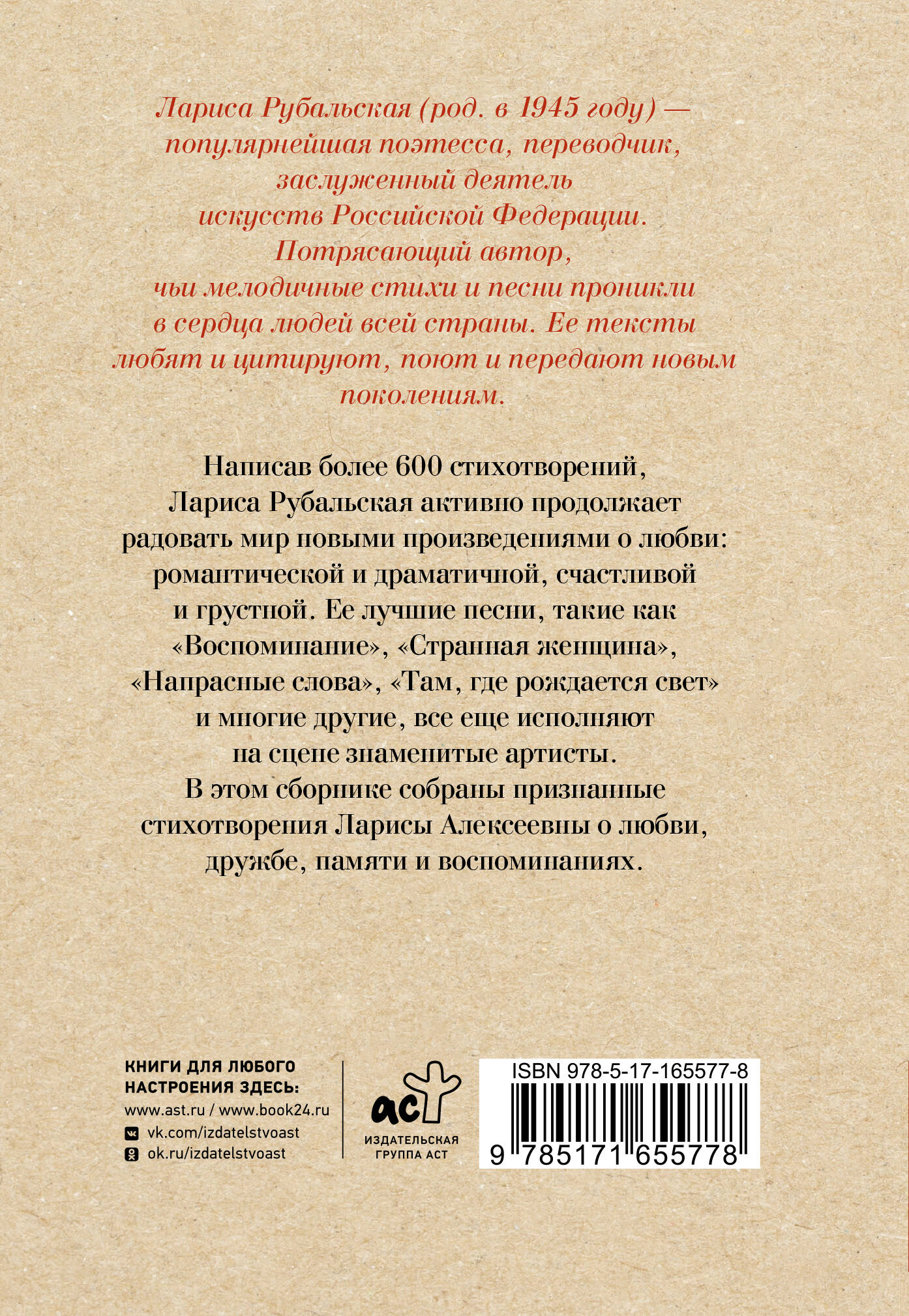 Лариса Рубальская (род. в 1945 году) популярнейшая поэтесса, переводчик, заслуженный деятель искусств Российской Федерации. Потрясающий автор, чьи мелодичные стихи и песни проникли в сердца людей всей страны. Ее тексты любят и цитируют, поют и передают новым поколениям. Написав более 600 стихотворений, Лариса Рубальская активно продолжает радовать мир новыми произведениями о любви: романтической и драматичной, счастливой и грустной. Ее лучшие песни, такие как "Воспоминание", "Странная женщина", "Напрасные слова", "Там, где рождается свет" и многие другие, все еще звучат на сцене. В этом сборнике собраны признанные стихотворения Ларисы Алексеевны о любви, дружбе, памяти и воспоминаниях.| Издательство | Издательство "АСТ" |