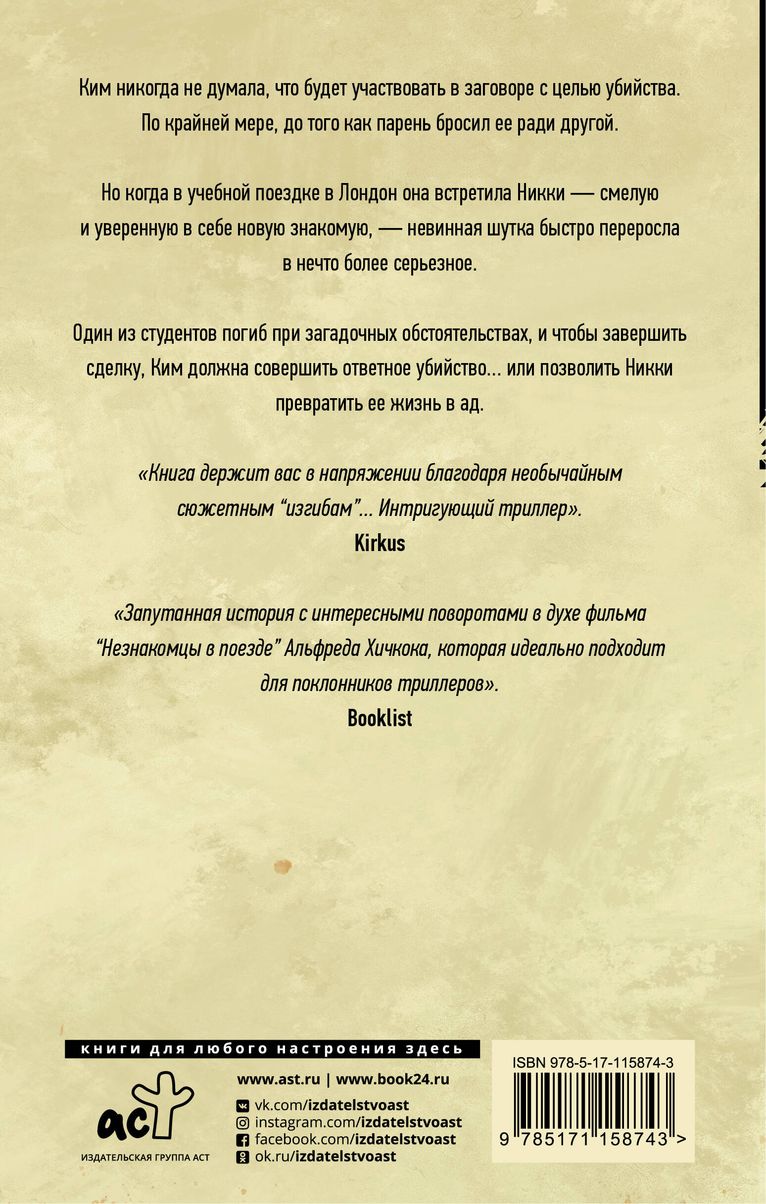 Ким никогда не думала, что будет участвовать в заговоре с целью убийства. По крайней мере, до того как парень бросил ее ради другой. Но когда в учебной поездке в Лондон она встретила Никки - смелую и уверенную в себе новую знакомую - невинная шутка быстро переросла в нечто более серьезное. Один из студентов погиб при загадочных обстоятельствах, и чтобы завершить сделку, Ким должна совершить ответное убийство… или позволить Никки превратить ее жизнь в ад.