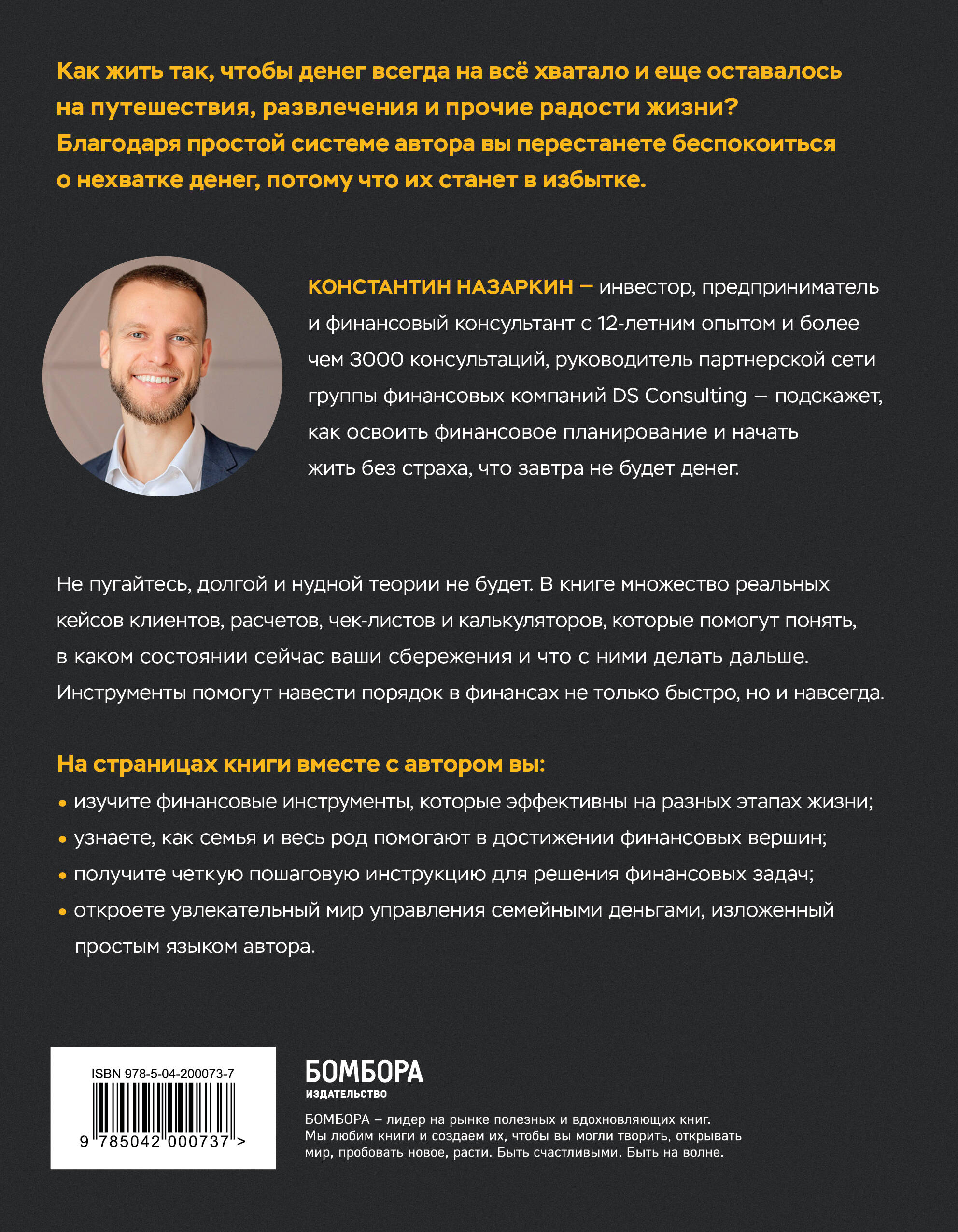 Как жить так, чтобы денег всегда на всё хватало и еще оставалось на путешествия, развлечения и прочие радости жизни? Благодаря простой авторской системе вы перестанете беспокоиться о нехватке денег, потому что их станет в избытке. Константин Назаркин - инвестор, предприниматель и финансовый консультант с 12-летним опытом и более чем 3000 консультаций, руководитель партнерской сети группы финансовых компаний DS Consulting - подскажет, как освоить финансовое планирование и начать жить без страха, что завтра не будет денег. Не пугайтесь, долгой и нудной теории не будет. В книге множество реальных кейсов клиентов, расчетов, чек-листов и калькуляторов, которые помогут понять, в каком состоянии сейчас ваши сбережения и что с ними делать дальше. Инструменты помогут навести порядок в финансах не только быстро, но и навсегда. На страницах книги вместе с автором вы: - изучите финансовые инструменты, которые эффективны на разных этапах жизни; - узнаете, как семья и весь род помогают в достижении финансовых вершин; - получите четкую пошаговую инструкцию для решения финансовых задач; - откроете увлекательный мир управления семейными деньгами, изложенный простым языком автора.| Издательство | ООО "Издательство "Эксмо" |