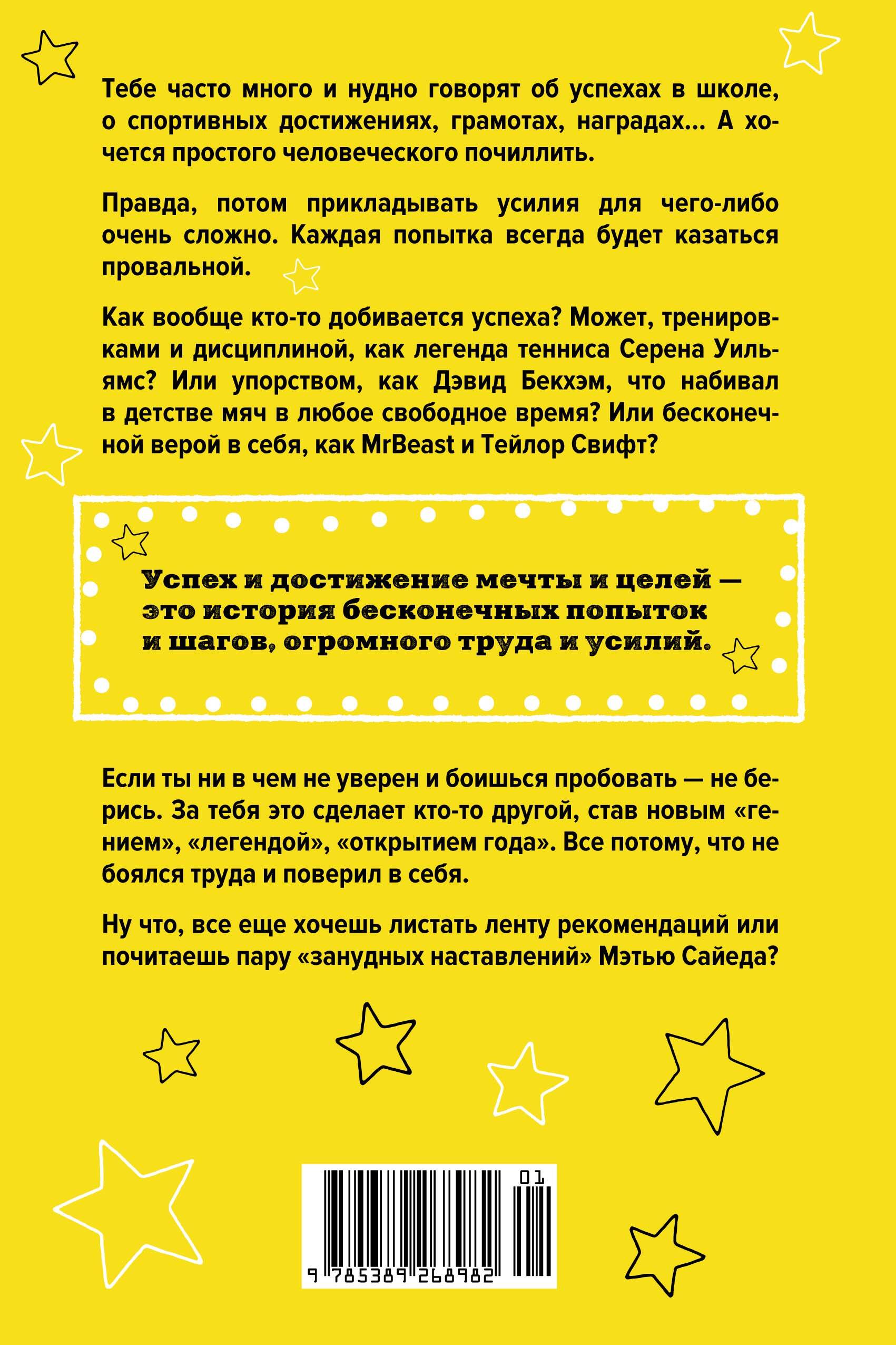 Тебе часто много и нудно говорят об успехах в школе, о спортивных достижениях, грамотах, наградах… А хочется простого человеческого почиллить. Правда, потом прикладывать усилия для чего-либо очень сложно. Каждая попытка всегда будет казаться провальной. Как вообще кто-то добивается успеха? Может, тренировками и дисциплиной, как легенда тенниса Серена Уильямс? Или упорством, как Дэвид Бекхэм, что набивал в детстве мяч в любое свободное время? Или бесконечной верой в себя, как MrBeast и Тейлор Свифт? Успех и достижение мечты и целей - то история бесконечных попыток и шагов, огромного труда и усилий. Если ты ни в чем не уверен и боишься пробовать - не берись. За тебя это сделает кто-то другой, став новым "гением", "легендой", "открытием года". Все потому, что не боялся труда и поверил в себя. Ну что, все еще хочешь листать ленту рекомендаций или почитаешь пару "занудных наставлений" Мэтью Сайеда?