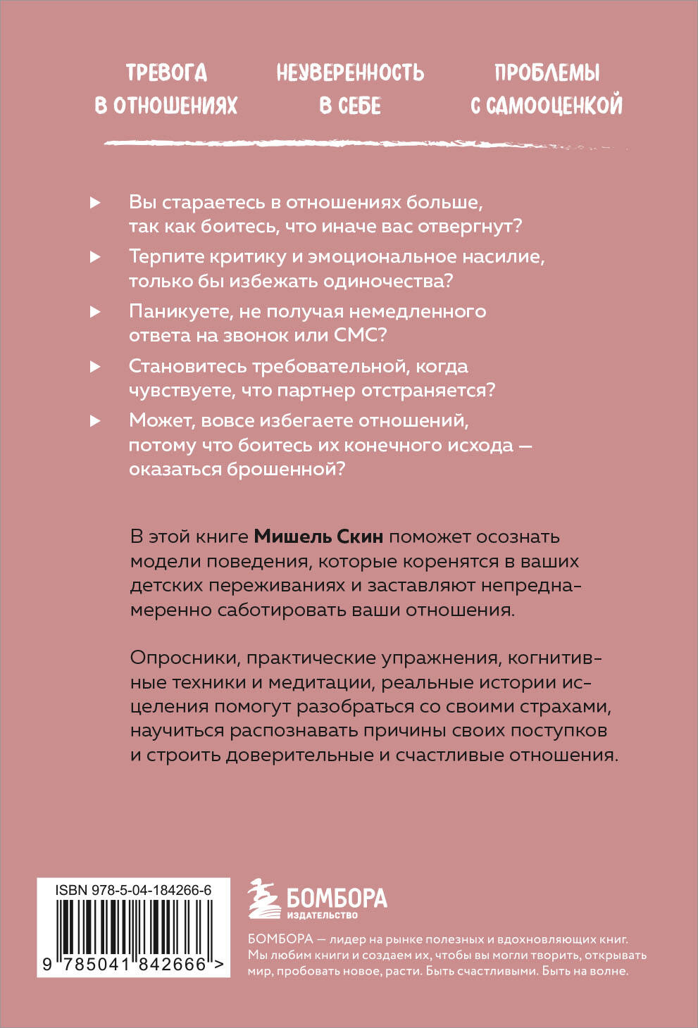 Эта книга поможет справиться: - с тревогой в отношениях; - с неуверенностью в себе; - с проблемами с самооценкой. Вы стараетесь в отношениях больше, так как боитесь, что иначе вас отвергнут? Терпите критику и эмоциональное насилие, только бы избежать одиночества? Прячете свое истинное «я», потому что считаете, что вас сочтут недостаточно хорошей? Паникуете, не получая немедленного ответа на звонок или сообщение? Становитесь требовательной, когда чувствуете, что партнер отстраняется? Или уходите сами, прежде чем он успеет бросить вас? Может, вовсе избегаете отношений, потому что боитесь их конечного исхода - оказаться брошенной? В этой книге Мишель Скин поможет осознать модели поведения, которые коренятся в ваших детских переживаниях и заставляют непреднамеренно саботировать ваши отношения. Опросники, практические упражнения, когнитивные техники и медитации, реальные истории исцеления помогут разобраться со своими страхами, научиться распознавать причины своих поступков и строить доверительные и счастливые отношения.| Издательство | ООО "Издательство "Эксмо" |