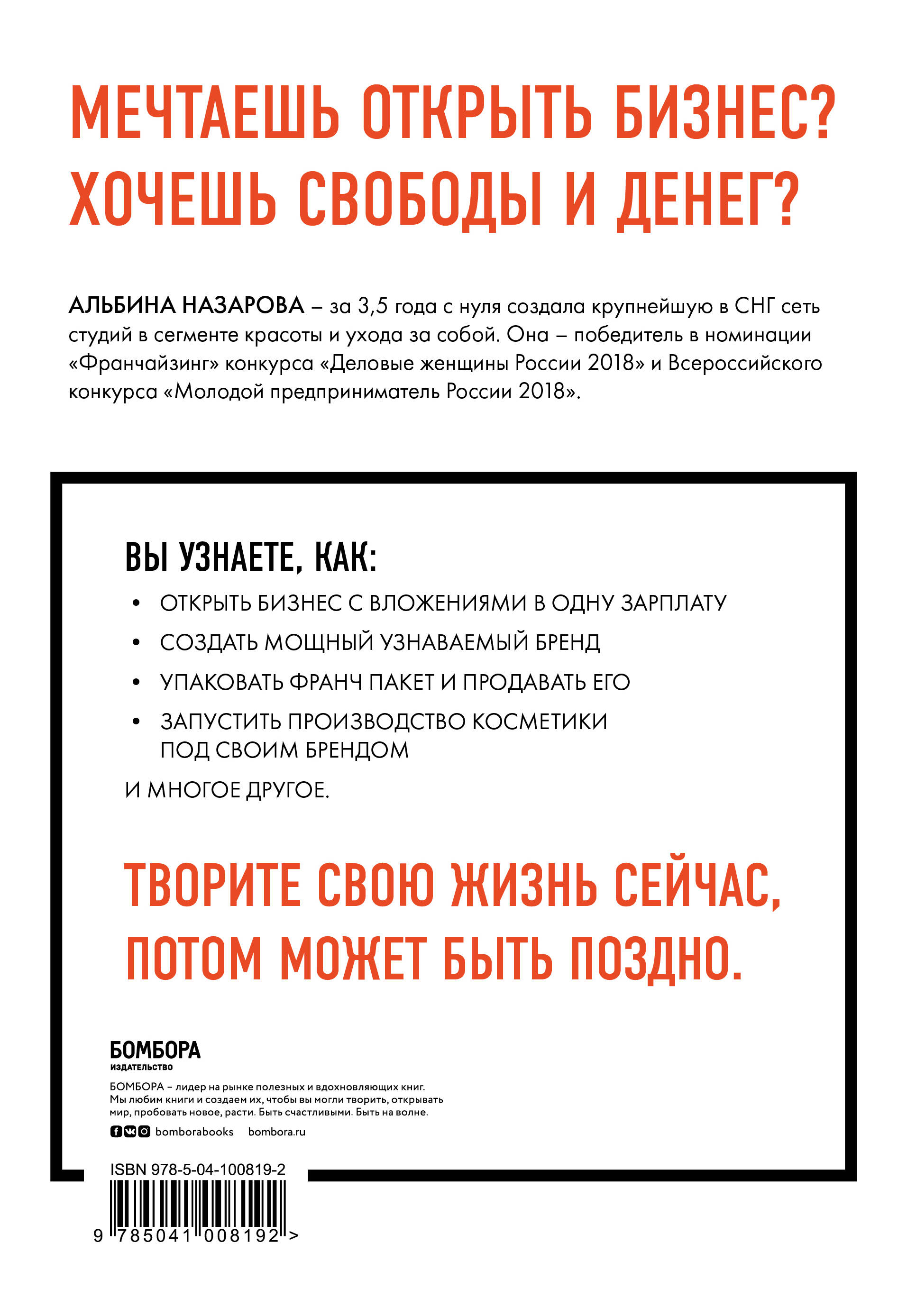 Альбина Назарова открыто делится своим опытом и знаниями, является востребованным спикером на отраслевых и бизнес-конференциях. На сегодняшний день она выступает на образовательных мероприятиях с темами: "Стратегия масштабного бизнеса", "Пошаговый запуск франшиз". Книга вдохновит вас на великие свершения и поможет изменить жизнь.| Издательство | ООО "Издательство "Эксмо" |