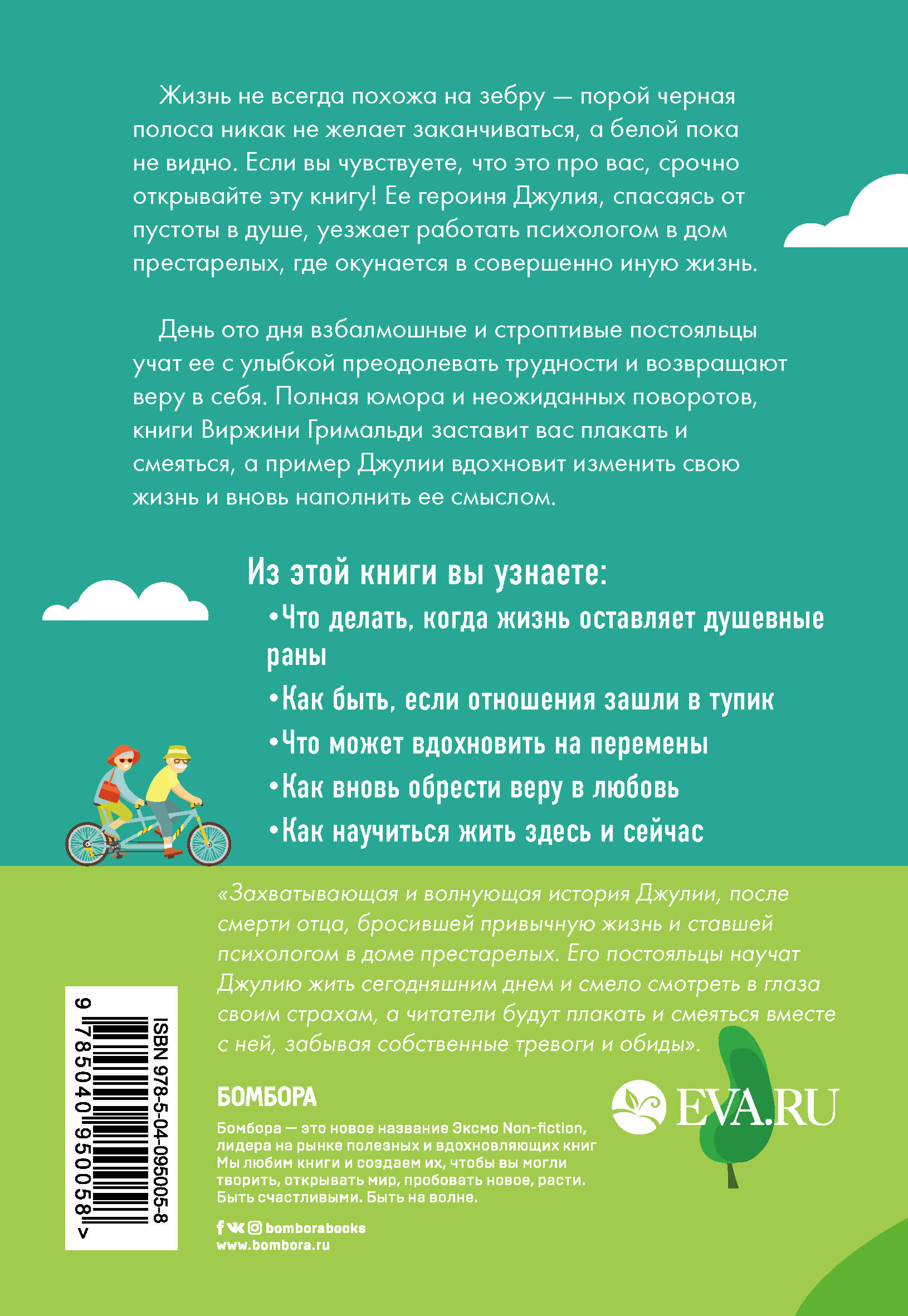 Жизнь не всегда похожа на зебру - порой черная полоса никак не желает заканчиваться, а белой пока не видно. Если вы чувствуете, что это про вас, срочно открывайте эту книгу! Ее героиня Джулия теряет отца и, спасаясь от пустоты в душе, уезжает работать психологом в дом престарелых, где окунается в совершенно иную жизнь. День ото дня взбалмошные и строптивые постояльцы учат ее с улыбкой преодолевать трудности и возвращают веру в себя. Полная юмора и неожиданных поворотов, книги Виржини Гримальди заставит вас плакать и смеяться, сопереживать героям и радоваться их маленьким победам, а пример Джулии вдохновит изменить свою жизнь и вновь наполнить ее смыслом.| Издательство | ООО "Издательство "Эксмо" |