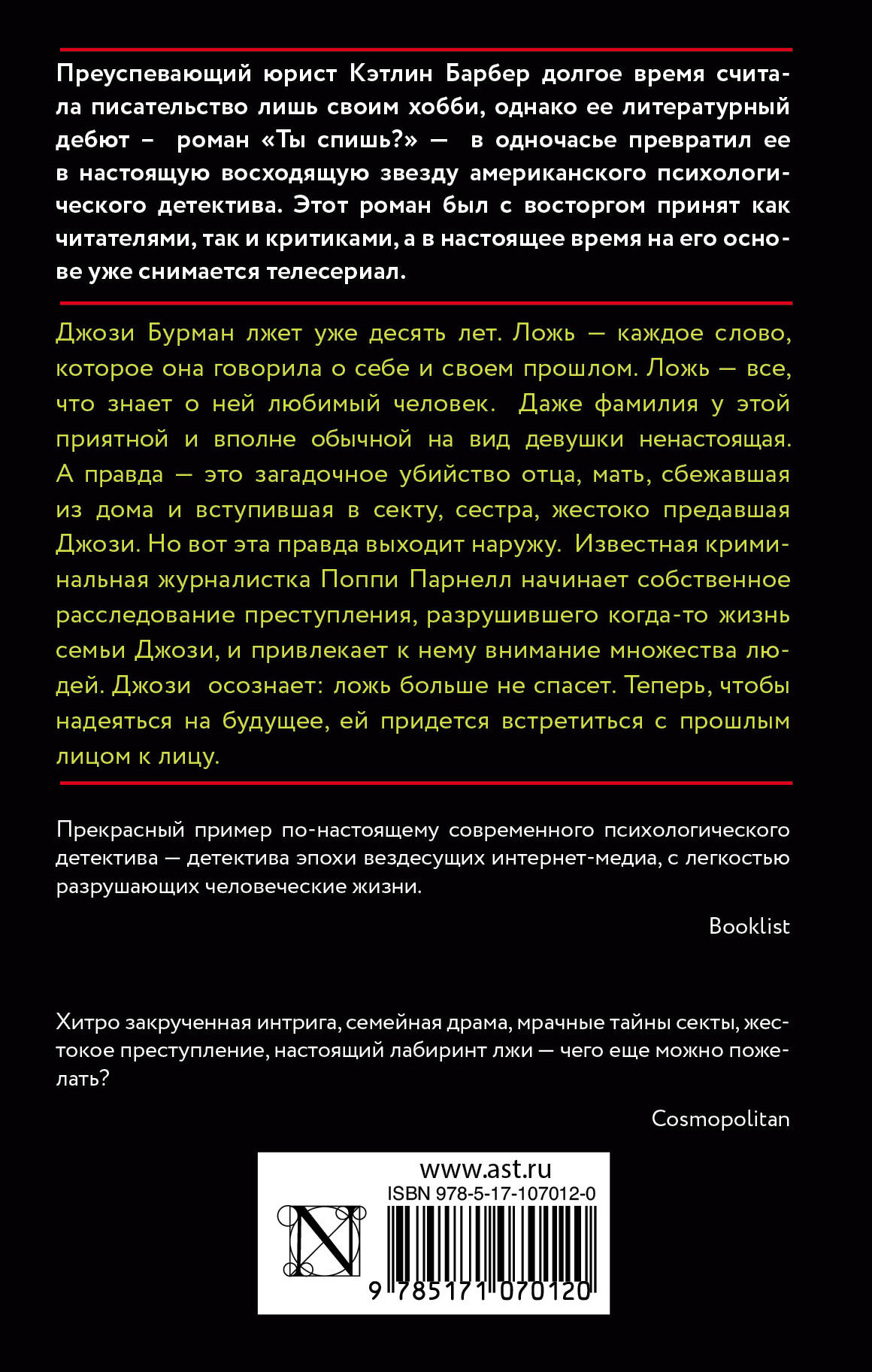 Джози Бурман лжет уже десять лет. Ложь - каждое слово, которое она говорила о себе и своем прошлом. Ложь - все, что знает о ней любимый человек. Даже фамилия у этой приятной и вполне обычной на вид девушки ненастоящая. А правда - это загадочное убийство отца, мать, сбежавшая из дома и вступившая в секту, сестра, жестоко предавшая Джози. Но вот эта правда выходит наружу. Известная криминальная журналистка Поппи Парнелл начинает собственное расследование преступления, разрушившего когда-то жизнь семьи Джози, и привлекает к нему внимание множества людей. Джози осознает: ложь больше не спасет. Теперь, чтобы надеяться на будущее, ей придется встретиться с прошлым лицом к лицу.| Издательство | ИЗДАТЕЛЬСТВО "АСТ" |