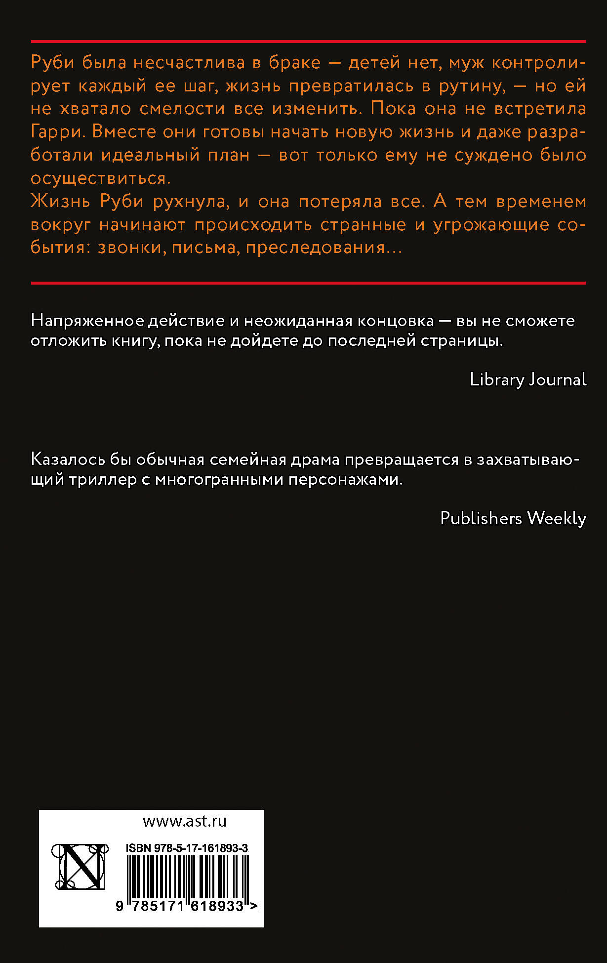 Руби была несчастлива в браке - детей нет, муж контролирует каждый ее шаг, жизнь превратилась в рутину, - но ей не хватало смелости все изменить. Пока она не встретила Гарри. Вместе они готовы начать новую жизнь и даже разработали идеальный план - вот только ему не суждено было осуществиться. Жизнь Руби рухнула, и она потеряла все. А тем временем вокруг начинают происходить странные и угрожающие события: звонки, письма, преследования…| Издательство | Издательство "АСТ" |