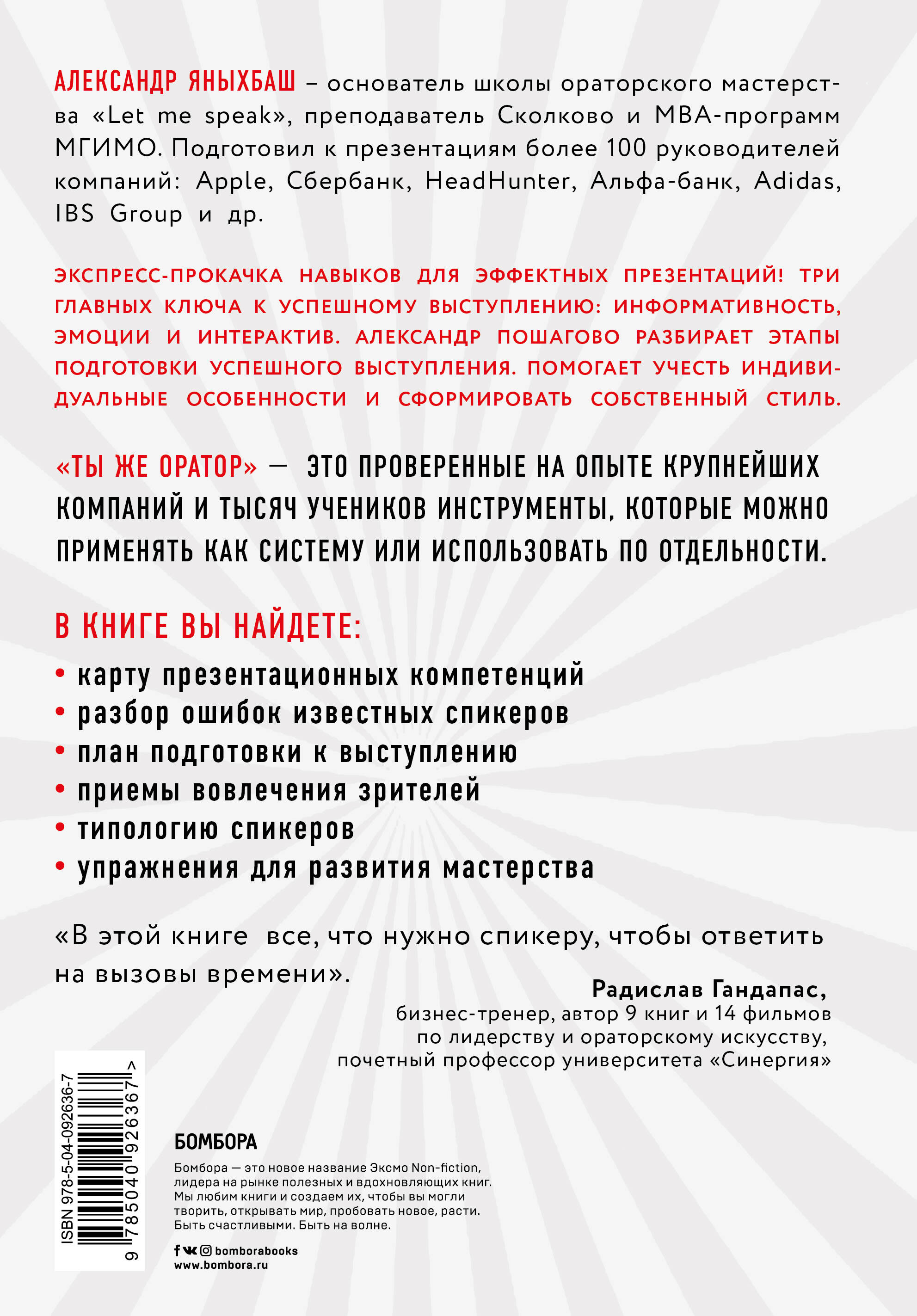 Александр Яныхбаш - основатель школы ораторского мастерст- ва «Let me speak», преподаватель Сколково и МВА-программ МГИМО. Подготовил к презентациям более 100 руководителей компаний: Apple, Сбербанк, HeadHunter, Альфа-банк, Adidas, IBS Group и др. Экспресс-прокачка навыков для эффектных презентаций! Три главных ключа к успешному выступлению: информативность, эмоции и интерактив. Александр пошагово разбирает этапы подготовки успешного выступления. Помогает учесть индиви- дуальные особенности и сформировать собственный стиль. «Ты же оратор» - это проверенные на опыте крупнейших компаний и тысяч учеников инструменты, которые можно применять как систему или использовать по отдельности. В книге вы найдете: - карту презентационных компетенций - разбор ошибок известных спикеров - план подготовки к выступлению - приемы вовлечения зрителей - типологию спикеров - упражнения для развития мастерства «В этой книге все, что нужно спикеру, чтобы ответить на вызовы времени». Радислав Гандапас, бизнес-тренер, автор 9 книг и 14 фильмов по лидерству и ораторскому искусству, почетный профессор университета «Синергия»| Издательство | ООО "Издательство "Эксмо" |