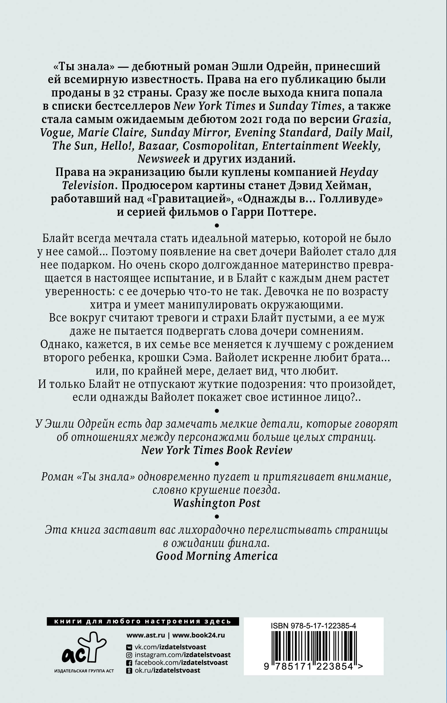Роман Эшли Одрейн «Ты знала», с которого стартует новая серия «(Не)преступление» - это напряжённая, цепляющая и провокационная психологическая драма, которая придётся по душе всем поклонникам мировых бестселлеров «Исчезнувшая» и «Девушка в поезде». Блайт никогда не знала счастливого детства, поэтому женщина всегда мечтала, что для своих детей она станет идеальной матерью, и рождение на свет дочери Вайолет стало настоящим подарком. Но с каждым прожитым днём в Блайт крепнет уверенность, что с её дочерью что-то не так. Вайолет не по годам умна и коварна, блестяще умеет манипулировать взрослыми, а самое главное, все окружающие, включая мужа самой Блайт, списывают её страхи на психоз, постродовую депрессию и ревность и даже не пытаются подвергать поступки малютки сомнениям. Когда в семье рождается второй ребёнок, малютка Сэмми, ситуация, вроде бы, меняется к лучшему. Кажется, что Вайолет искренне любит братика, но Блайт продолжают снедать подозрения, что как только её бдительность ослабнет, случится трагедия, и дочка покажет истинное лицо. Но не будет ли тогда слишком поздно?| Издательство | ИЗДАТЕЛЬСТВО "АСТ" |