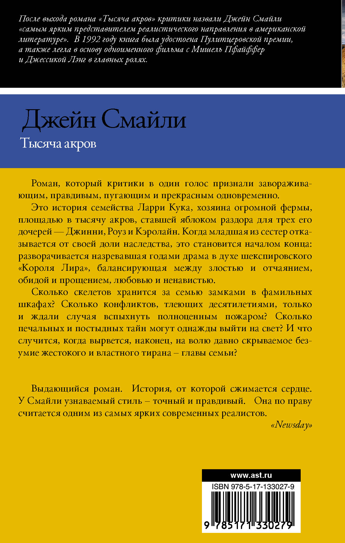Роман, который критики в один голос признали завораживающим, правдивым, пугающим и прекрасным одновременно. Это история семейства Ларри Кука, хозяина огромной фермы, площадью в тысячу акров, ставшей яблоком раздора для трех его дочерей - Джинни, Роуз и Кэролайн. Когда младшая из сестер отказывается от своей доли наследства, это становится началом конца: разворачивается назревавшая годами драма в духе шекспировского "Короля Лира", балансирующая между злостью и отчаянием, обидой и прощением, любовью и ненавистью. Сколько скелетов хранится за семью замками в фамильных шкафах? Сколько конфликтов, тлеющих десятилетиями, только и ждали случая вспыхнуть полноценным пожаром? Сколько печальных и постыдных тайн могут однажды выйти на свет? И что случится, когда вырвется, наконец, на волю давно скрываемое безумие жестокого и властного тирана - главы семьи?| Издательство | Издательство "АСТ" |