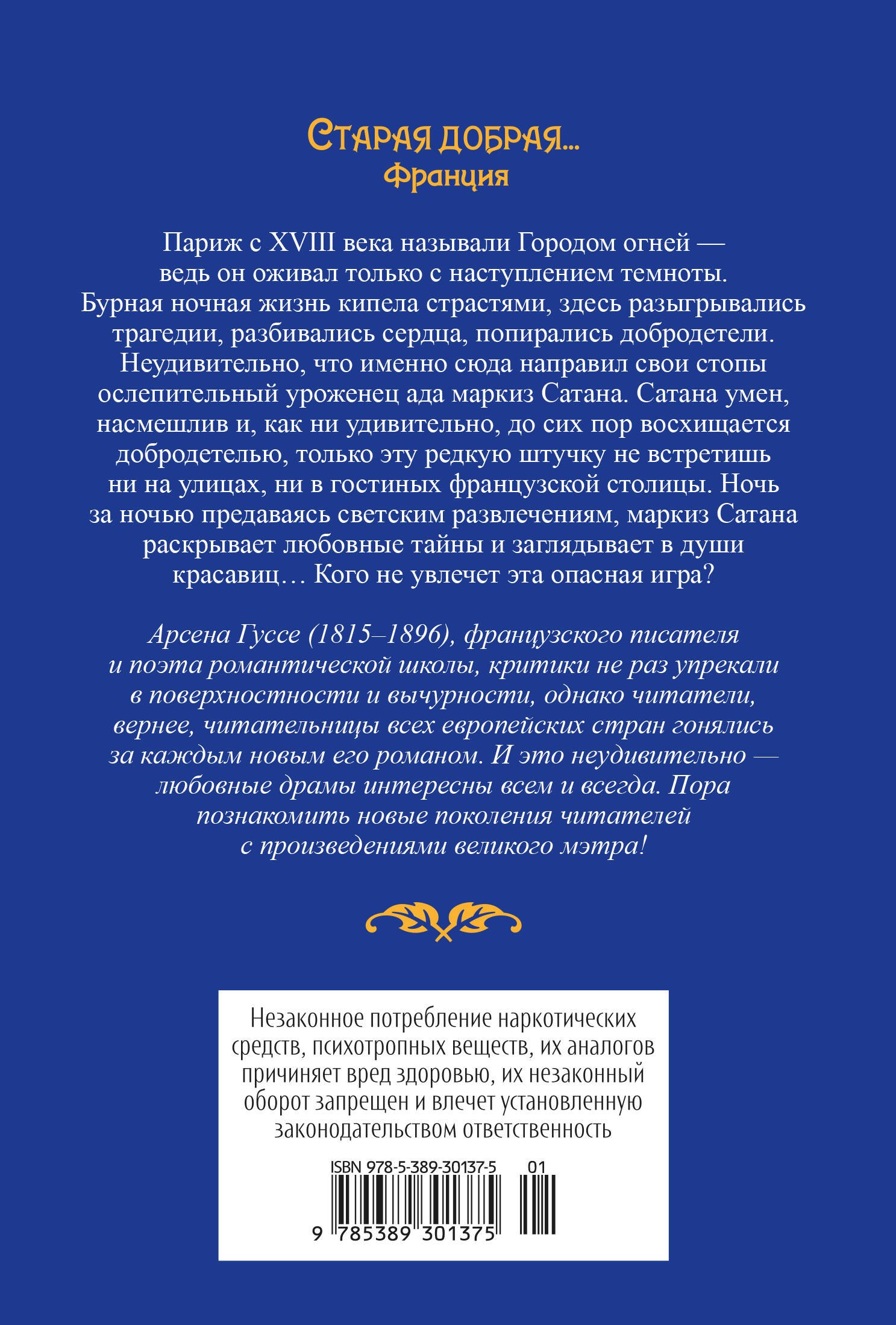Роман-сага, посвященный жизни ночного светского и не только Парижа конца XIX века, роман-калейдоскоп, причудливое переплетение историй страсти и любви, рассказанных автору его приятелем - самым настоящим посланцем Ада маркизом Сатаной не оставит равнодушным ни одну читательницу, а, может, и читателя. Сюжетов, как указано в названии, множество, но вот затравка основного: «Однажды поздним вечером, заскучав, пять сумасбродных светских девиц решили выпить чаю в обществе самого Сатаны. Ну или одного из его подручных. Был проделан ритуал вызова, и самая отчаянная, самая гордая, а также самая красивая Жанна д'Арманьяк предложила нечистому духу себя саму сроком на год. И четверти часа не прошло, как слуга доложил о прибытии маркиза Сатаны. Невероятный красавец, он любезными речами утешил перепуганных девиц, выпил чашку чая и удалился, пообещав Жанне, что каждую полночь станет являться к ней. И, как нетрудно догадаться, обещание свое маркиз выполнил. Он еще и влюбился в красавицу, но та его отвергла ради обаятельного игрока и мота. Но не ждите счастливого - хотя как, конечно, посмотреть, - финала. Парижский свет и полусвет, и, следуя за ними, все прочие слои общества буквально питаются и дышат страстями, а в такой атмосфере процветают только пороки. Собственно, именно потому во французской столице конца XVIII века появился черт, изгнанный за грехи из ада. Но нравы прекрасных парижанок, изученные им на протяжении тысячи и одной ночи, изумили даже его…» Роман в 28 книгах и 4 томах, созданный французским писателем Арсеном Гуссе, которого Эмиль Золя называл «одним из последних великих дубов романтического леса», пользовался, как и прочие его произведения, числом более 100, в России огромной популярностью. Он был написал в 1875 году, а в Москве начала продаваться в 1877-м! Читать «Тысяча и одну тайну парижских ночей» это: 1. Окунуться с головой в светскую жизнь Парижа XIX века, узнать как, в чем и зачем ездят в лес, в театр и на балы 2. Познакомиться с десятками светских львиц и одной невероятной красавицей и убедиться, что, как и теперь, решиться на рай в шалаше можно только по невероятной любви 3. Выяснить, что самый настоящий черт из Ада порой более человечен и сострадателен, чем некоторые прекрасные дамы 4. Посетить несколько дуэлей и вызнать несколько действенных мошеннических приемов 5. Обнаружить, что любовная страсть и истинная любовь чувства не только различные, но и диаметрально противоположные чувства. Книга порадует не только поклонников романтической литературы и плутовского романа, но и ценителей мистики, а также тех, кто интересуется историей Франции и историей любви.| Издательство | Издательство АЗБУКА ООО |