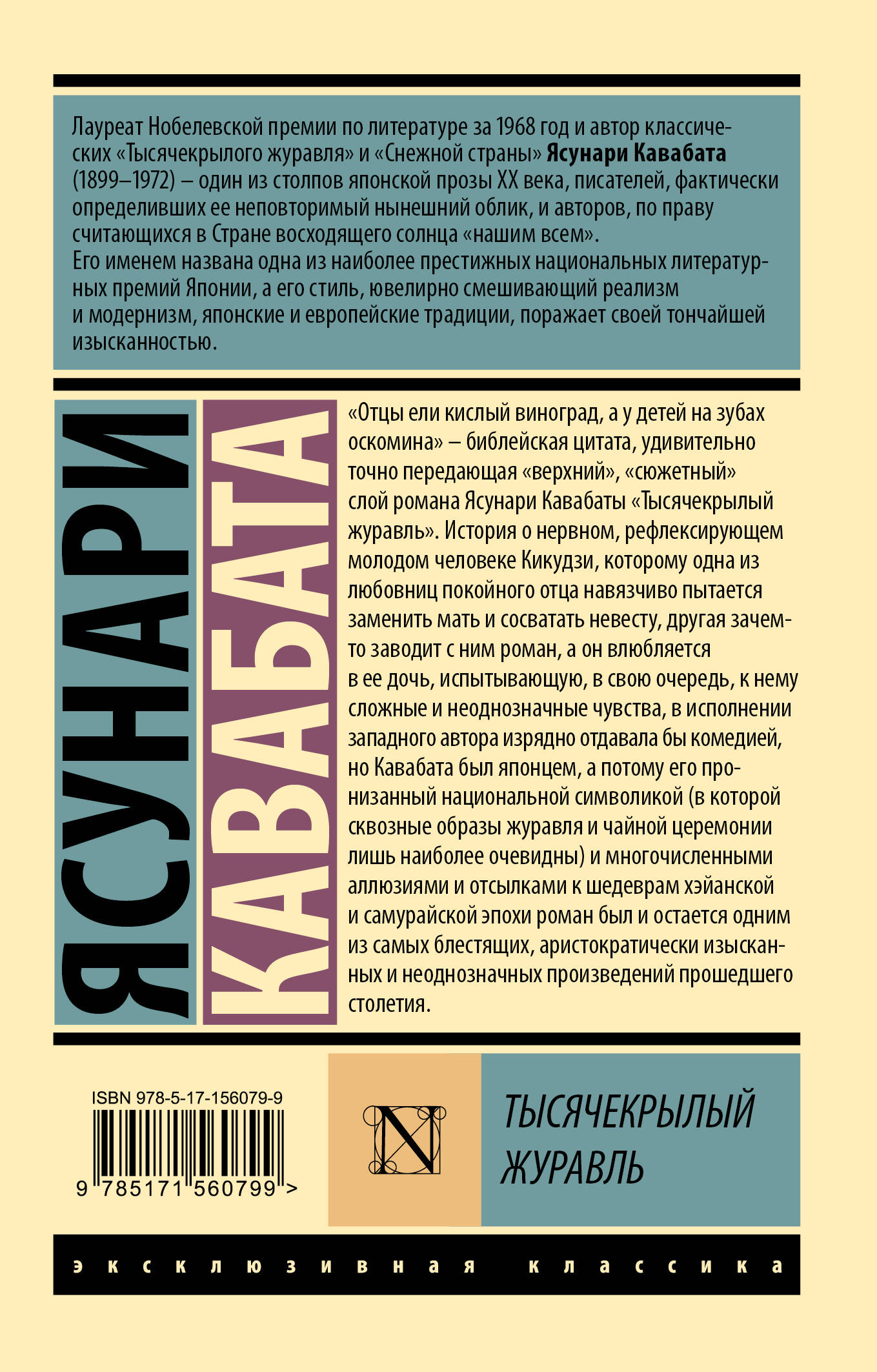"Отцы ели кислый виноград, а у детей на зубах оскомина" - библейская цитата, удивительно точно передающая "верхний", "сюжетный" слой романа Ясунари Кавабаты "Тысячекрылый журавль". История о нервном, рефлексирующем молодом человеке Кикудзи, которому одна из любовниц покойного отца навязчиво пытается заменить мать и сосватать невесту, другая зачем-то заводит с ним роман, а он влюбляется в ее дочь, испытывающую, в свою очередь, к нему сложные и неоднозначные чувства, в исполнении западного автора изрядно отдавала бы комедией, но Кавабата был японцем, а потому его пронизанный национальной символикой (в которой сквозные образы журавля и чайной церемонии лишь наиболее очевидны) и многочисленными аллюзиями и отсылками к шедеврам хэйанской и самурайской эпохи роман был и остается одним из самых блестящих, аристократически изысканных и неоднозначных произведений прошедшего столетия.| Издательство | Издательство "АСТ" |