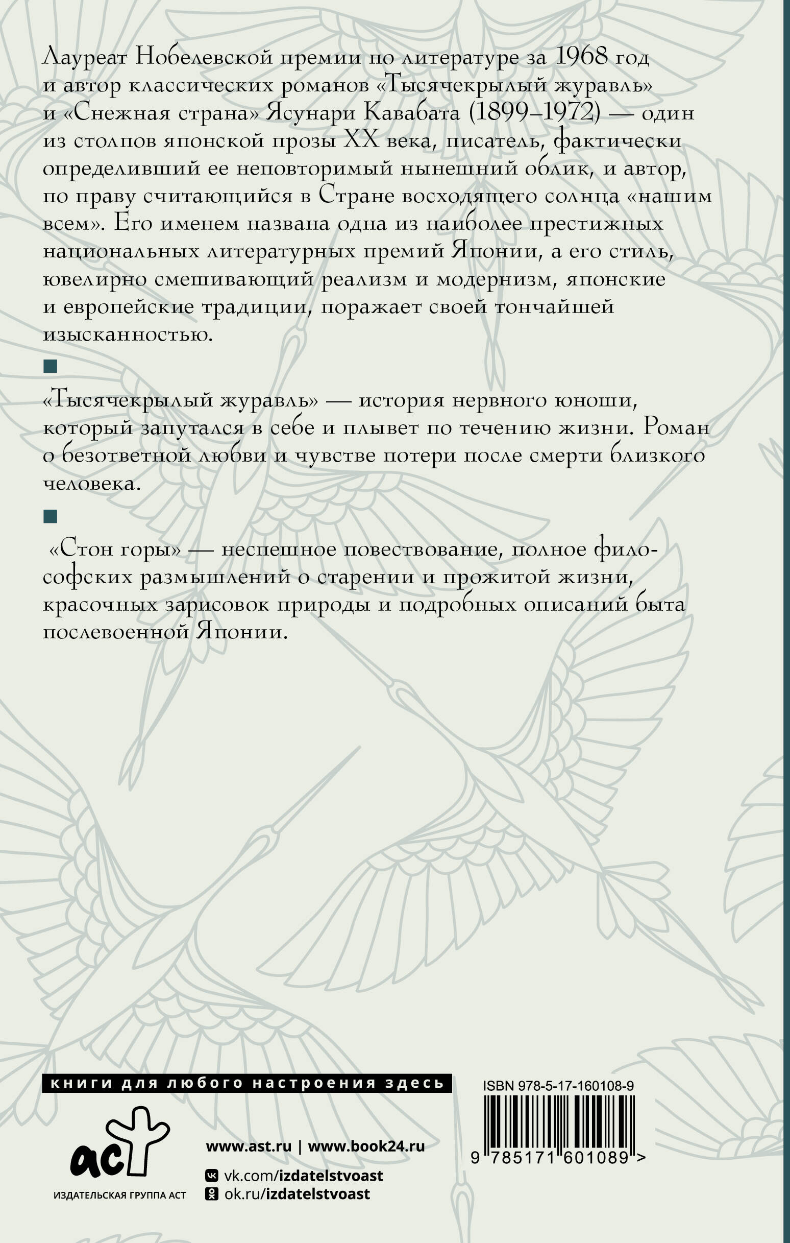 "Тысячекрылый журавль" - история нервного юноши, который запутался в себе и плывет по течению жизни. Роман о безответной любви и чувстве потери после смерти близкого человека. "Стон горы" - неспешное повествование, полное философских размышлений о старении и прожитой жизни, красочных зарисовок природы и подробных описаний быта послевоенной Японии.