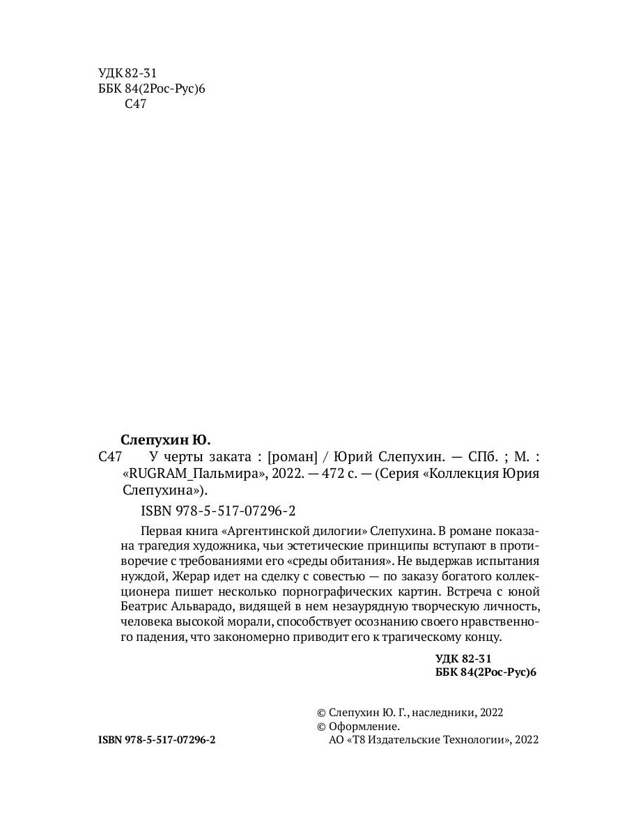 Первая книга «Аргентинской дилогии» Слепухина. В романе показана трагедия художника, чьи эстетические принципы вступают в противоречие с требованиями его «среды обитания». Не выдержав испытания нуждой, Жерар идет на сделку с совестью - по заказу богатого коллекционера пишет несколько порнографических картин. Встреча с юной Беатрис Альварадо, видящей в нем незаурядную творческую личность, человека высокой морали, способствует осознанию своего нравственного падения, что закономерно приводит его к трагическому концу.| Издательство | Т8 RUGRAM |
