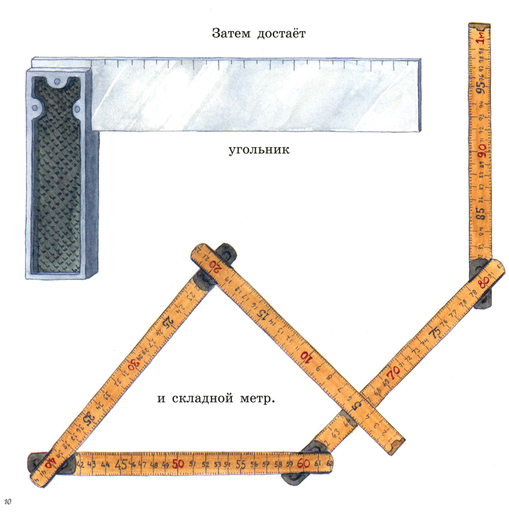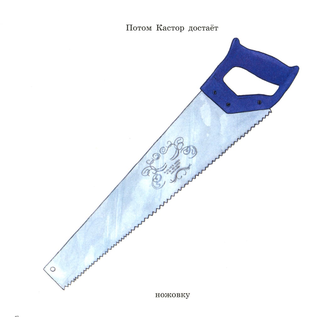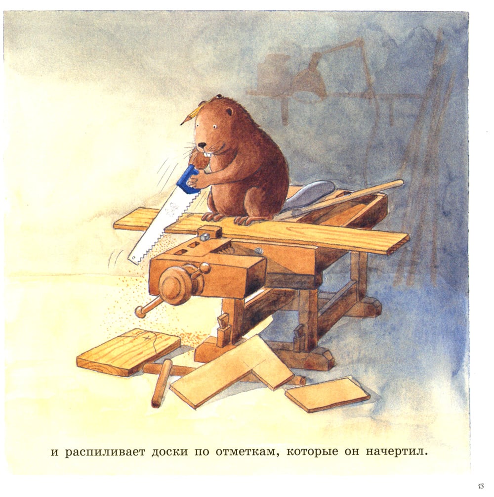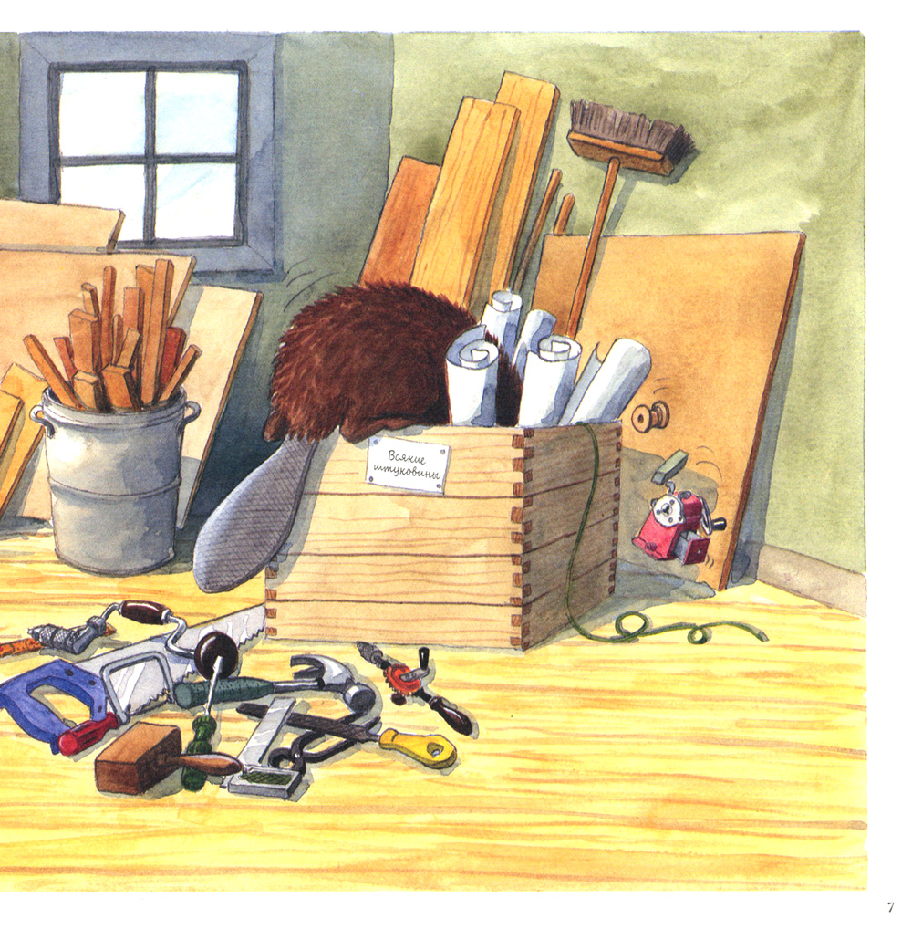 В книге «У Кастора в мастерской» неутомимый Кастор самостоятельно изготавливает деревянный ящичек для инструментов. Он берет чертеж, расчерчивает дощечки при помощи складного метра и угольника, выпиливает детали пилой и лобзиком, сверлит в нужных местах отверстия, ошкуривает напильником и наждачной бумагой заготовки и наконец соединяет все части шурупами и гвоздями. Готово!