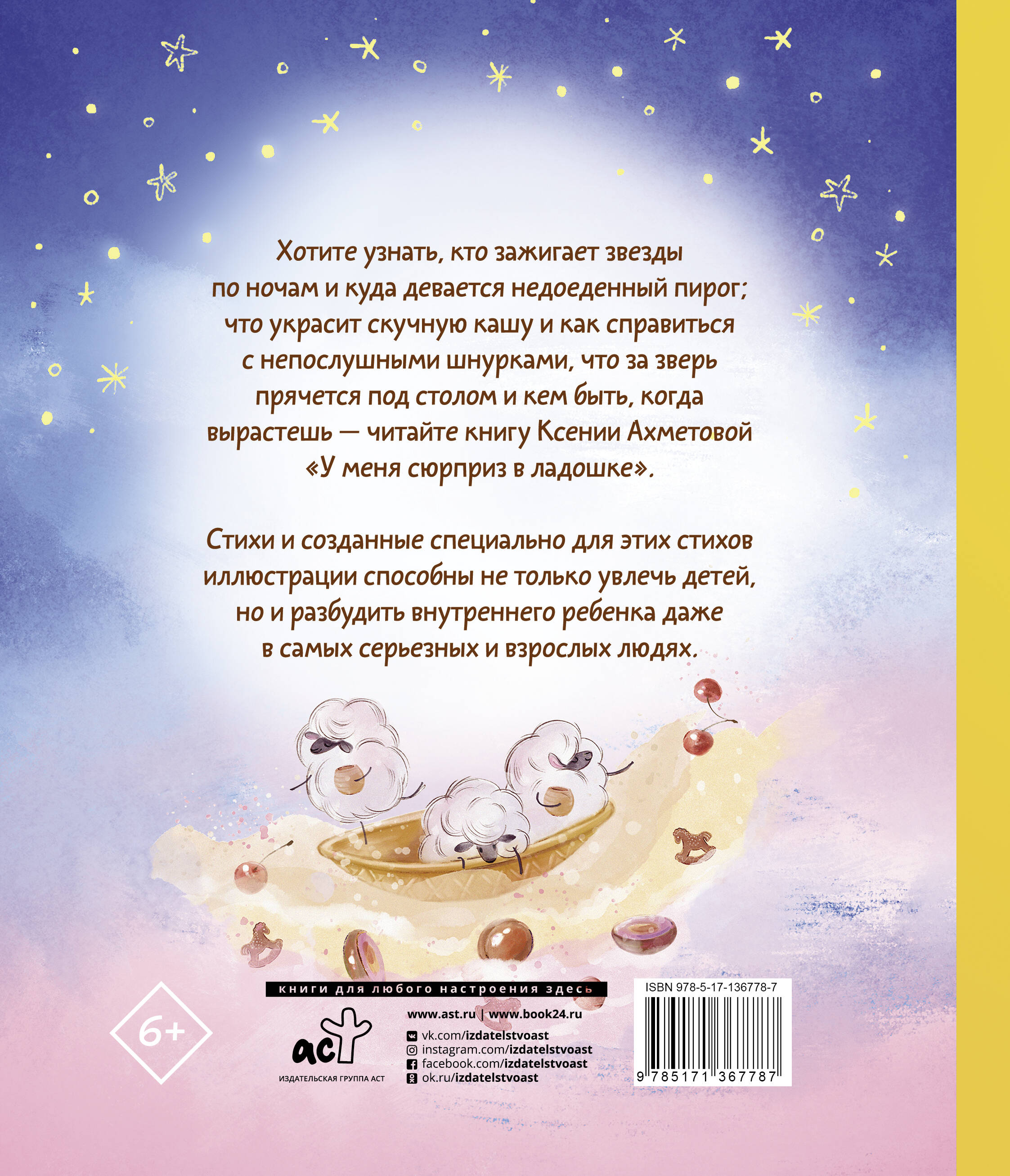 Хотите узнать, кто зажигает звезды по ночам и куда девается недоеденный пирог; что украсит скучную кашу и как справиться с непослушными шнурками, что за зверь прячется под столом и кем быть, когда вырастешь, - читайте книгу Ксении Ахметовой "У меня сюрприз в ладошке". Стихи и созданные специально для них иллюстрации способны не только увлечь детей, но и разбудить внутреннего ребенка даже в самых серьезных и взрослых людях.| Издательство | ИЗДАТЕЛЬСТВО "АСТ" |