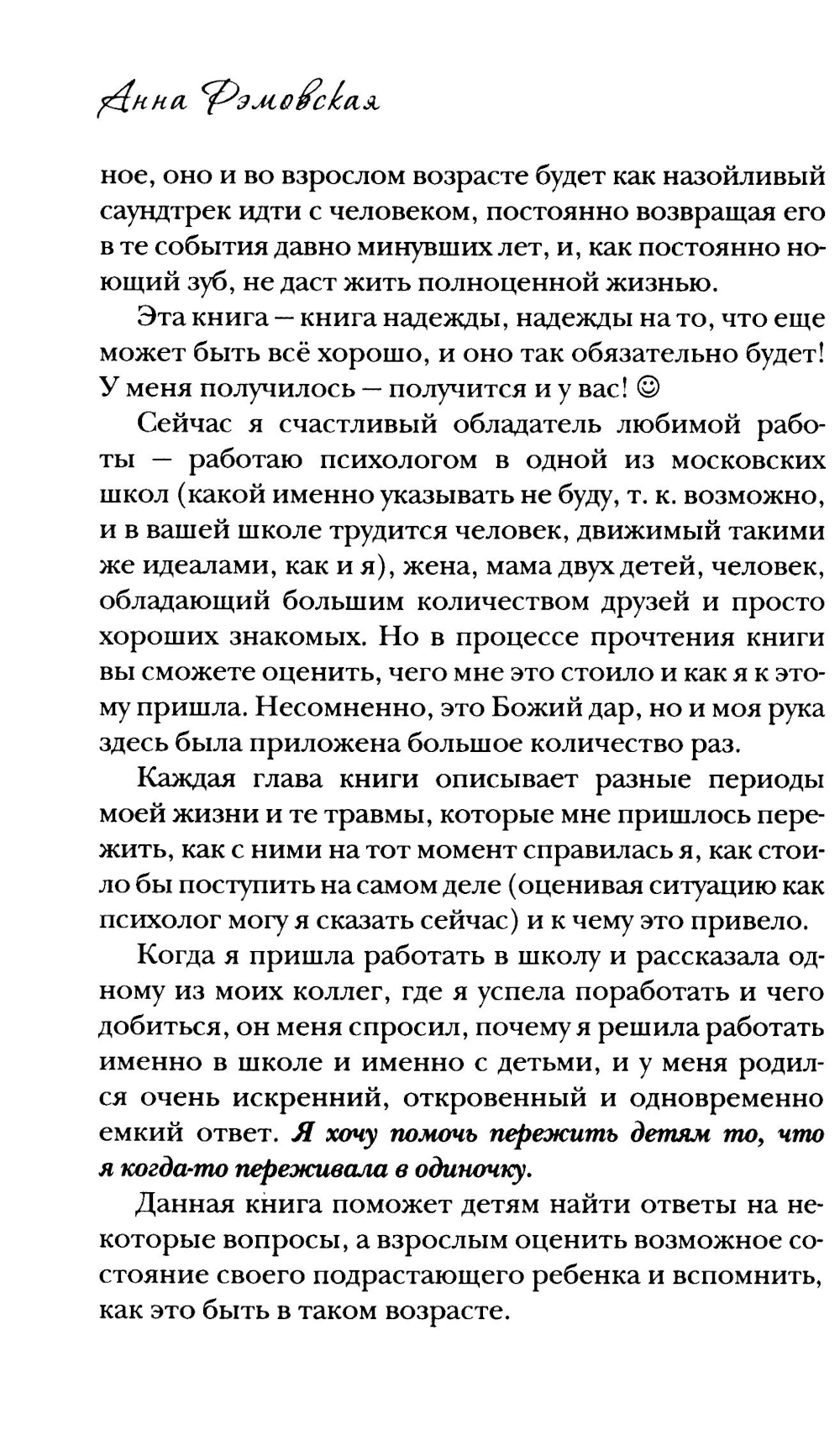 Анна Рэмовская - практикующий мультимодальный психолог-консультант, школьный педагог-психолог, член союза психологов и психотерапевтов г. Москва. Отзыв на мою книгу можно направить на электронную почту. Буду благодарна за обратную связь.| Издательство | Рипол Классик |