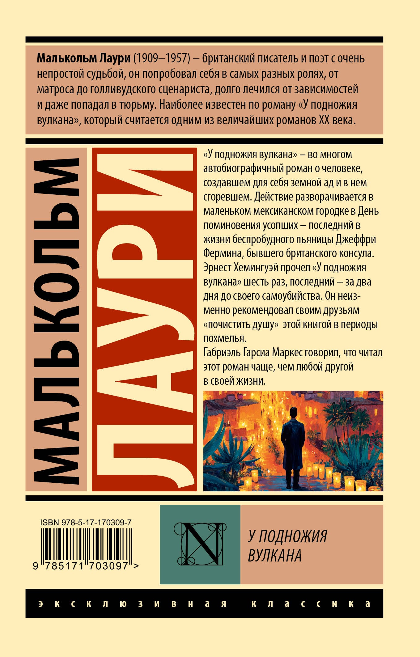 - «У подножия вулкана» - главный, и во многом автобиографический, роман Малькольма Лаури. - Малькольм Лаури - один из самых недооцененных писателей XX века, автор сборника «Услышь нас, Боже!». - Роман «У подножия вулкана» входит в сотню лучших англоязычных романов XX века по версии «Современной библиотеки», в сотню лучших книг века по версии издания n Le Monde и в сотню лучших книг всех времен по версии журнала Time. - Эрнест Хемингуэй перечитывал «У подножия вулкана», а Габриэль Гарсиа Маркес читал эту книгу чаще, чем любую другую в жизни. - В 1984 году роман был экранизирован легендарным режиссером Джоном Хьюстоном, главную роль сыграл известный британский актер Альберт Финни. - Издание в серии «Эксклюзивная классика» - в удобном карманном формате и узнаваемом оформлении.| Издательство | Издательство "АСТ" |