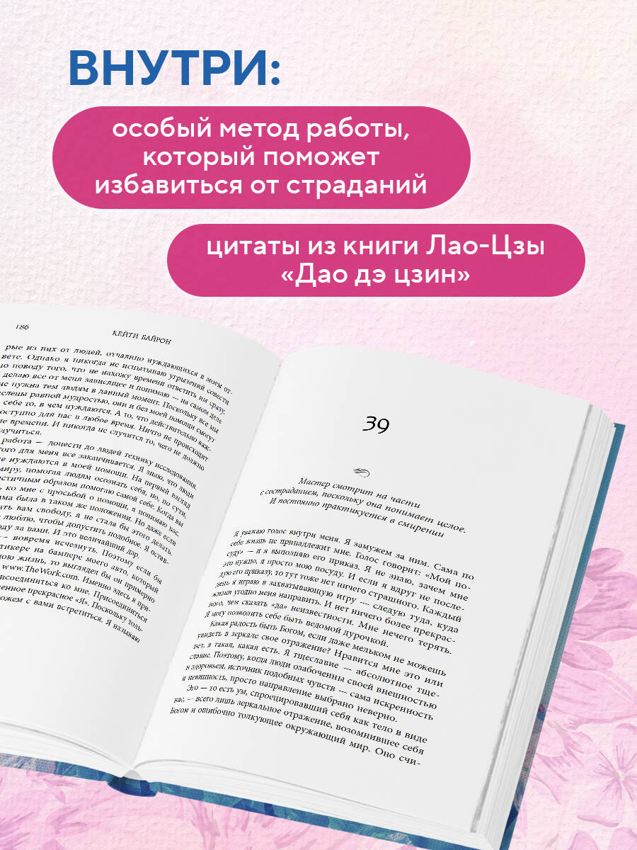 Один из постулатов Дао звучит так: «Когда люди думают, что знают ответы, людей трудно направлять. Когда они знают, что не знают, люди могут найти свой собственный путь». Работа Кэйти Байрон помогает увидеть, что даже небольшие изменения в восприятии приводят к серьезным изменениям в жизни. Автор отмечает, что закрытый разум - это закрытое сердце, но малейшая трещина может позволить человеку увидеть мир иным. Если вы знакомы с Кэйти и читали другие ее работы, вы, вероятно, знаете ее историю пробуждения в возрасте 43 лет после долгой депрессии. В этой книге она подробно описывает свой опыт и рассказывает, как она пришла к тому, чтобы исследовать все свои мысли и подвергать сомнению все свои убеждения. Эта книга поможет вам: - перестать страдать из-за того, на что вы не можете повлиять; - принять мир таким, какой он есть; - понять себя; - избавиться от боли, отравляющей вашу жизнь; - обрести гармонию.