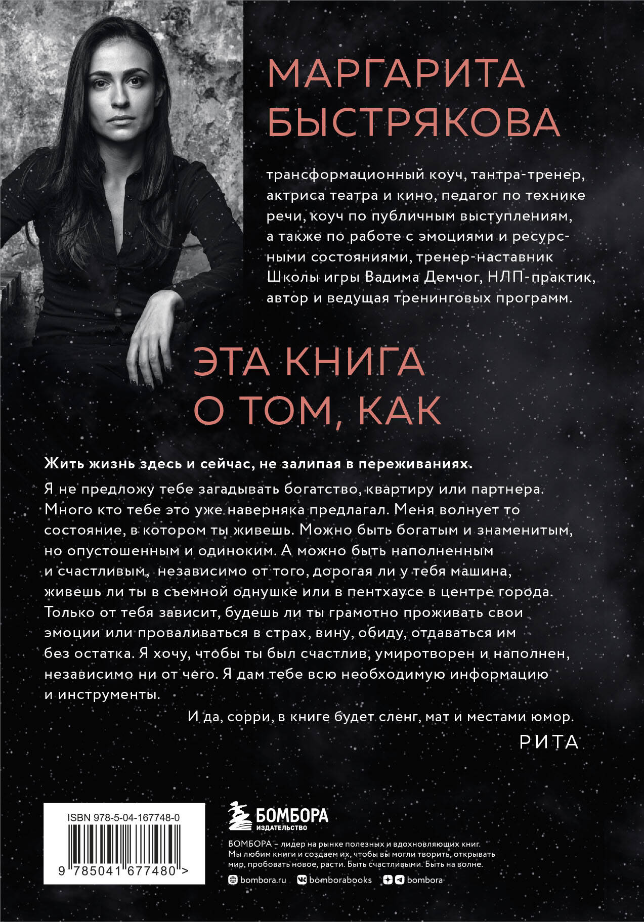 Жить жизнь здесь и сейчас, не залипая в переживаниях! Только от тебя зависит, будешь ли ты грамотно проживать свои эмоции или проваливаться в страх, вину, обиду, отдаваться им без остатка. Маргарита Быстрякова - трансформационный коуч, тантра-тренер, актриса театра и кино, педагог по технике речи, коуч по публичным выступлениям, а также по работе с эмоциями и ресурсными состояниями, тренер-наставник Школы игры Вадима Демчог, НЛП-практик, автор и ведущая тренинговых программ.| Издательство | ООО "Издательство "Эксмо" |