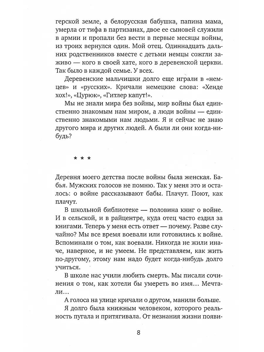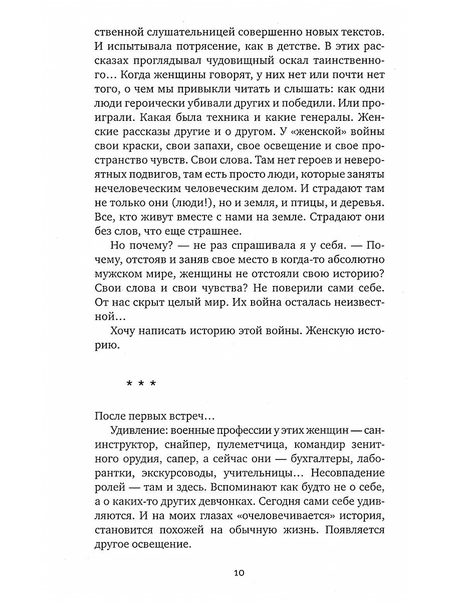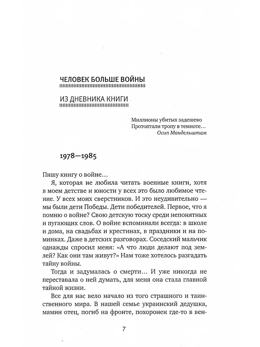 Одна из самых известных в мире книг о войне, положившая начало знаменитому художественно-документальному циклу Светланы Алексиевич «Голоса Утопии». Переведена более чем на двадцать языков, включена в школьные и вузовские программы во многих странах. Последняя авторская редакция: писательница, в соответствии со своим творческим методом, постоянно дорабатывает книгу, убирая цензурную правку, вставляя новые эпизоды, дополняя записанные женские исповеди страницами собственного дневника, который она вела в течение семи лет работы над книгой. «У войны не женское лицо» - опыт уникального проникновения в духовный мир женщины, выживающей в нечеловеческих условиях войны.| Издательство | Время |