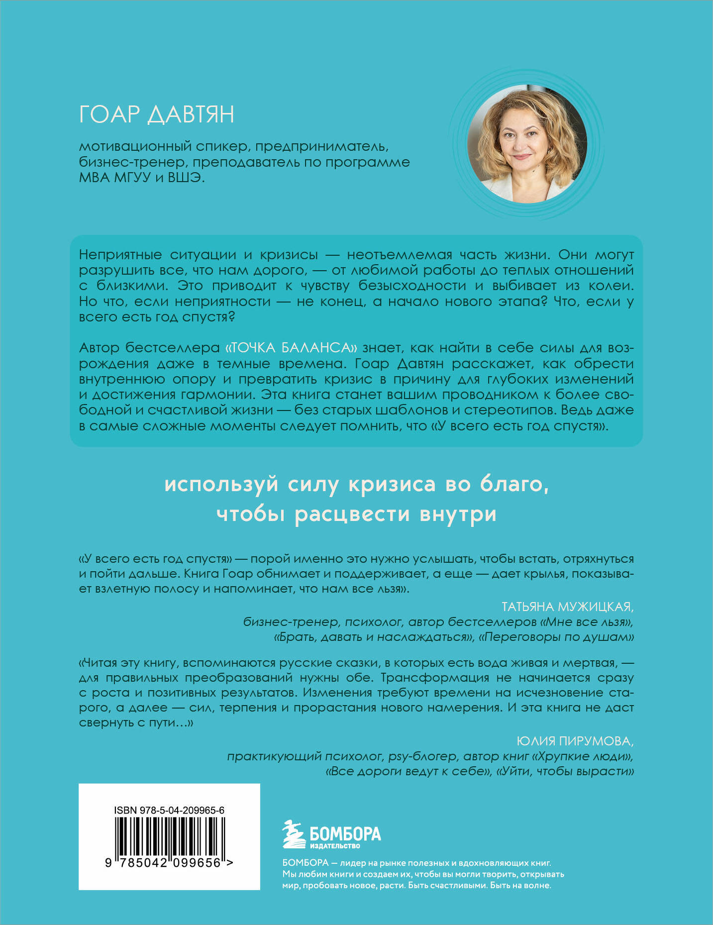 Неприятные ситуации и кризисы - неотъемлемая часть жизни. Они могут разрушить все, что нам дорого - от любимой работы до теплых отношений с близкими. Это приводит к чувству безысходности и выбивает из колеи. Но что, если неприятности - не конец, а начало нового этапа? Что, если у всего есть год спустя? Автор бестселлера «Точка Баланса» знает, как найти в себе силы для возрождения даже в темные времена. Гоар Давтян расскажет, как найти внутреннюю опору и превратить кризис в причину для глубоких изменений и достижения гармонии. Эта книга станет вашим путеводителем на пути к более свободной и счастливой жизни - без старых шаблонов и стереотипов. Ведь даже в самые сложные моменты следует помнить, что «У всего есть год спустя».