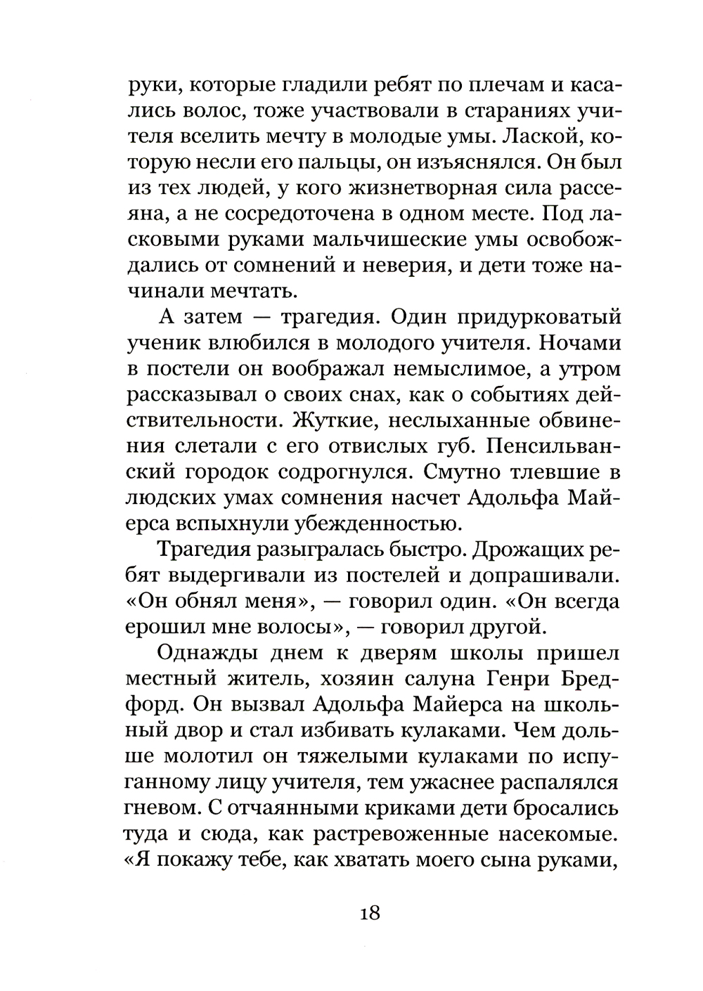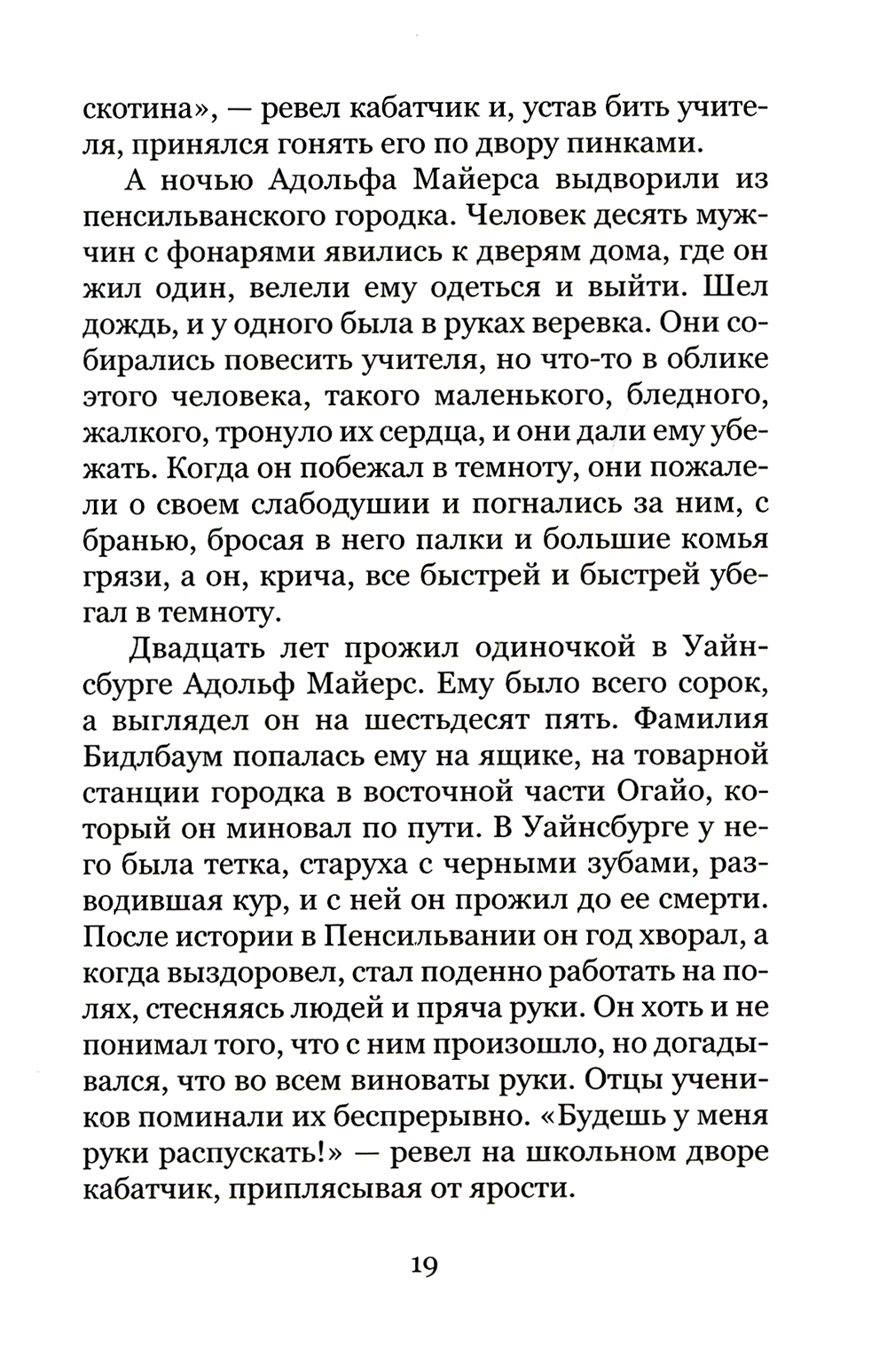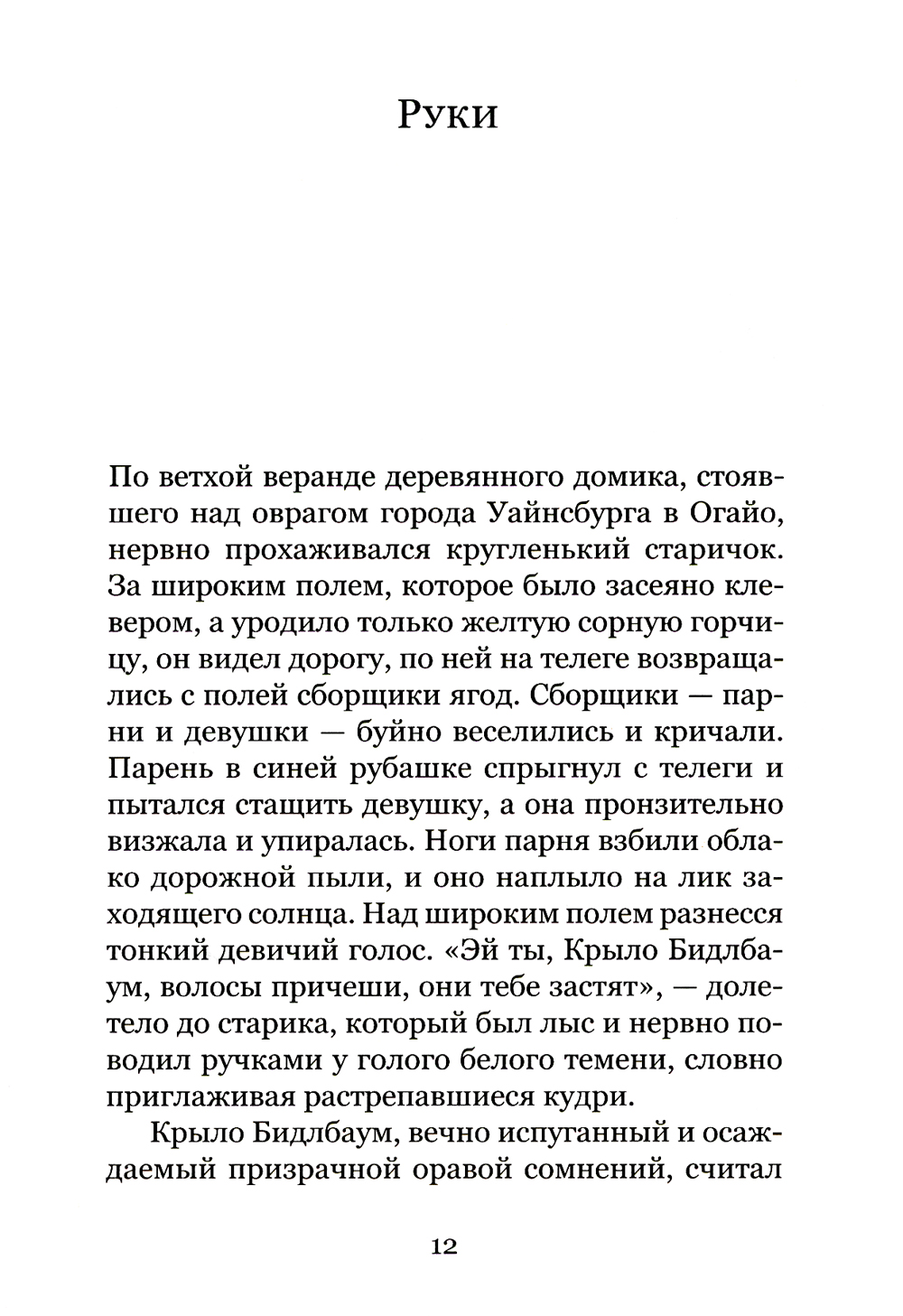 Шервуд Андерсон (1876-1941). блестящий новеллист, признанный классик американской литературы, вырос в маленьком городке на Среднем Западе в бедной семье. Был солдатом, управляющим фабрики, издателем, редактором. Литературную славу ему принес цикл рассказов «Уайнсбург, Огайо» (1919) о жизни американской провинции начала XX века. В странных судьбах героев, в их необычных характерах отразились понимание человеческой природы и весь жизненный опыт писателя. Творчество Андерсона оказало огромное влияние на развитие американской литературы, на становление таких мастеров, как Хемингуэй, Фолкнер, Стеинбек.| Издательство | Текст |