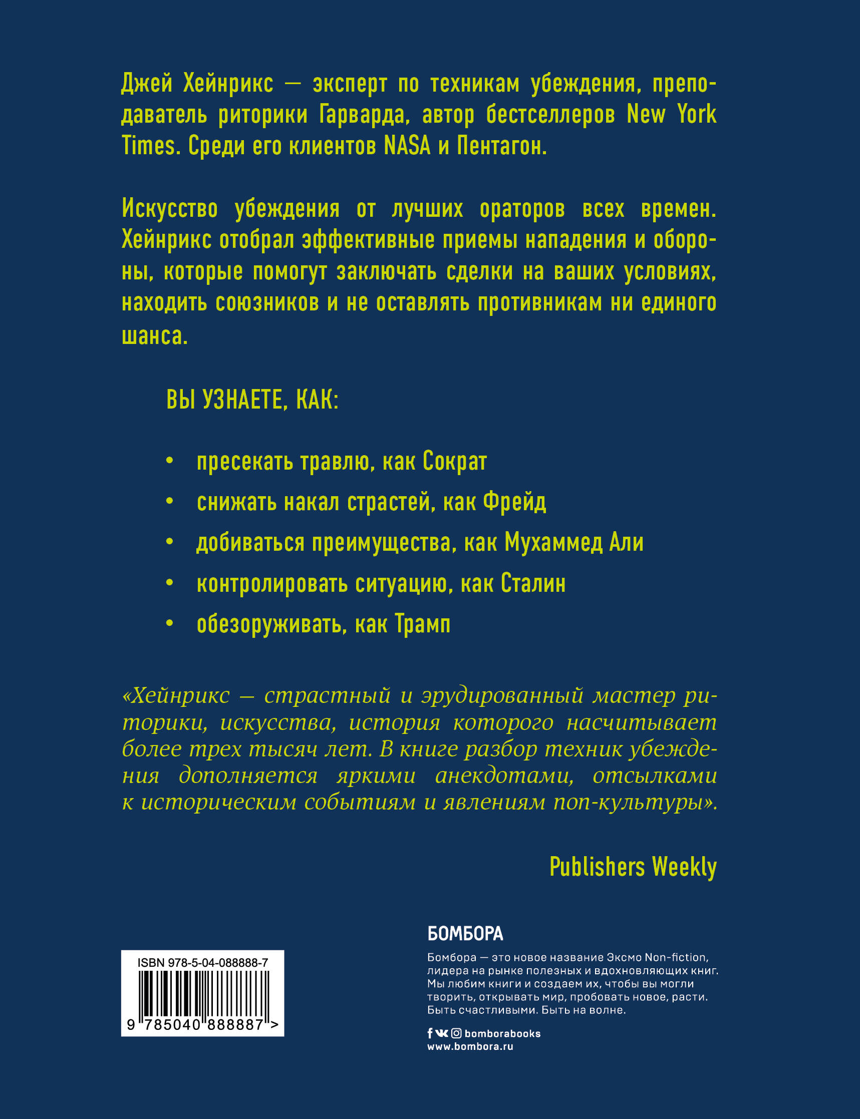 Джей Хейнрикс - эксперт по техникам убеждения, преподаватель риторики Гарварда, автор бестселлеров New York Times. Среди его клиентов NASA и Пентагон. Искусство убеждения от лучших ораторов всех времен. Хейнрикс отобрал эффективные приемы нападения и обороны, которые помогут заключать сделки на ваших условиях, находить союзников и не оставлять противникам ни единого шанса. Вы узнаете, как: - пресекать травлю, как Сократ - снижать накал страстей, как Фрейд - добиваться преимущества, как Мухаммед Али - контролировать ситуацию, как Сталин - обезоруживать, как Трамп «Хейнрикс - страстный и эрудированный мастер риторики, искусства, история которого насчитывает более трех тысяч лет. В книге разбор техник убеждения дополняется яркими анекдотами, отсылками к историческим событиям и явлениям поп-культуры» Publishers Weekly| Издательство | ООО "Издательство "Эксмо" |